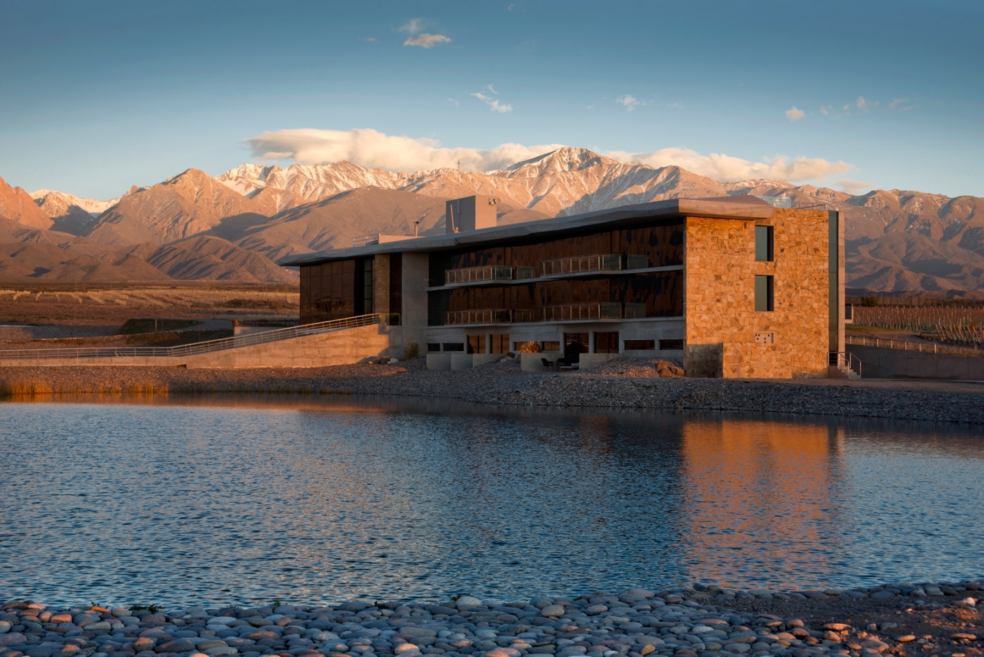 Set on a 790-acre estate in the foothills of the Andes Mountains, Casa de Uco has a sleek, minimalistic style designed to harmonize with the surrounding landscape. Common areas include an award-winning restaurant, wine bar and lounge, outdoor pool, game room, and a living room with fireplace. Terraces overlook the private vineyards, where guests can dine among the vines or participate in excursions like wine tasting, horseback riding, and carriage rides.