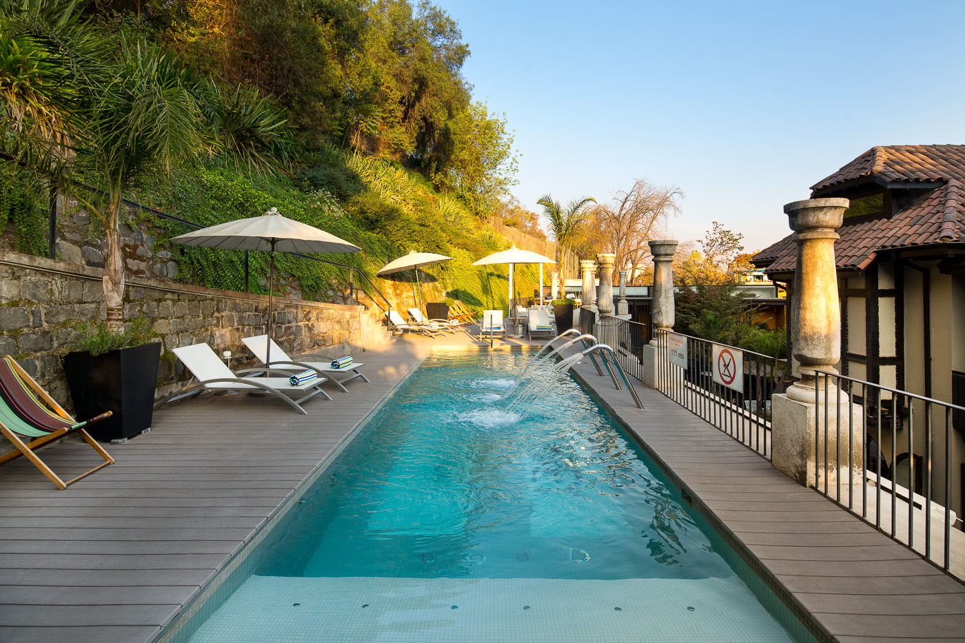 The Aubrey, located in Santiago’s lively Bellavista neighborhood, sits at the foot of the San Cristóbal Hill within the city’s Parque Metropolitano, one of the largest urban parks in the world. The hotel has 15 uniquely-designed rooms, most with balconies and terraces. The Aubrey was built in a renovated 1920s mansion and its neighboring house, linked by Mission-style stone terraces and a heated swimming pool. The hotel offers a restaurant and piano lounge, pool, spa, and loaner bicycles, and is within easy reach of Santiago’s top areas and attractions.