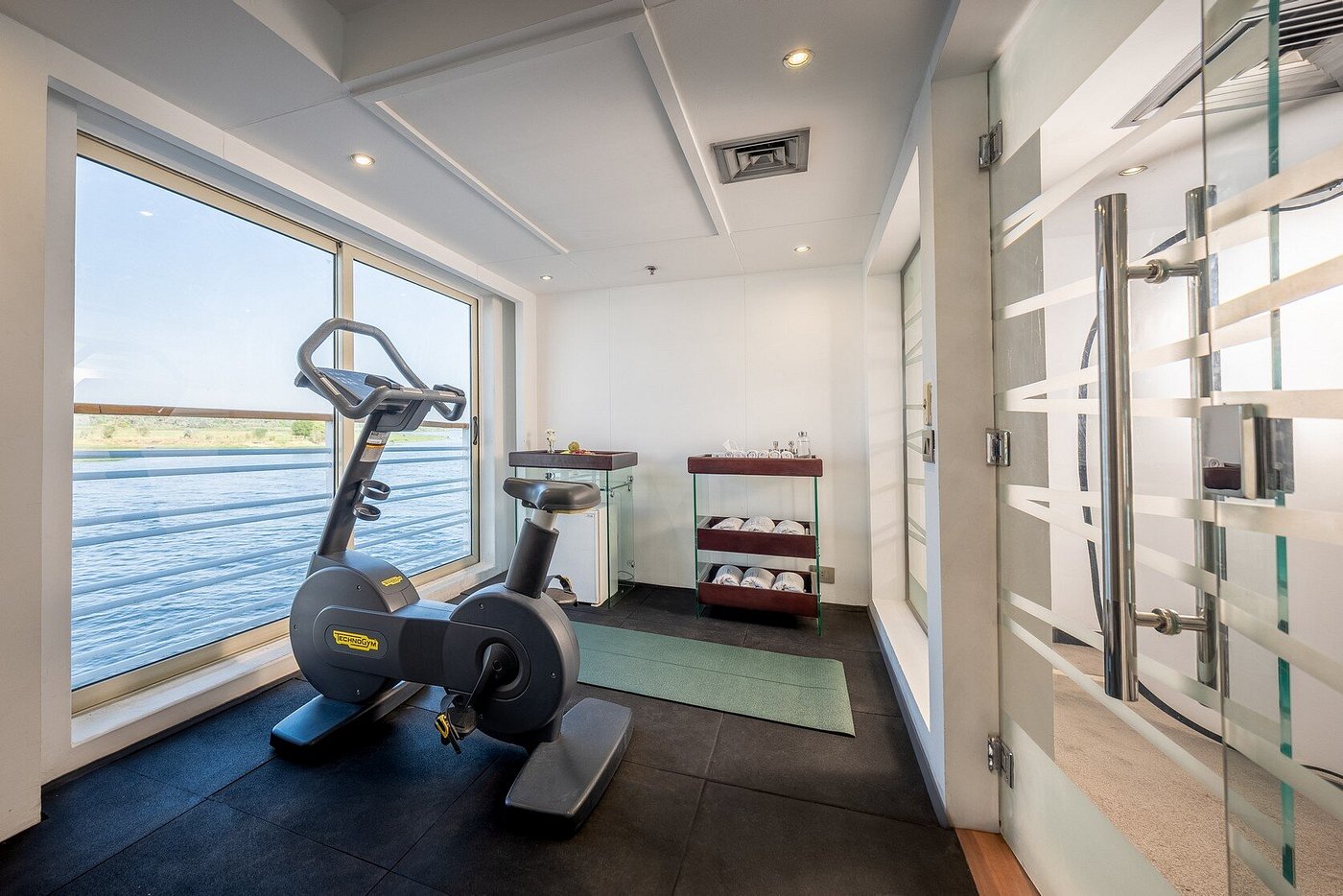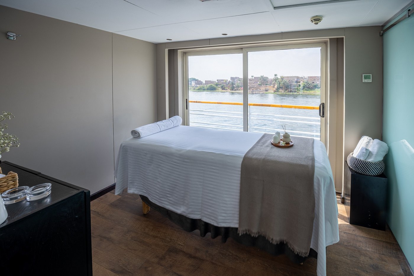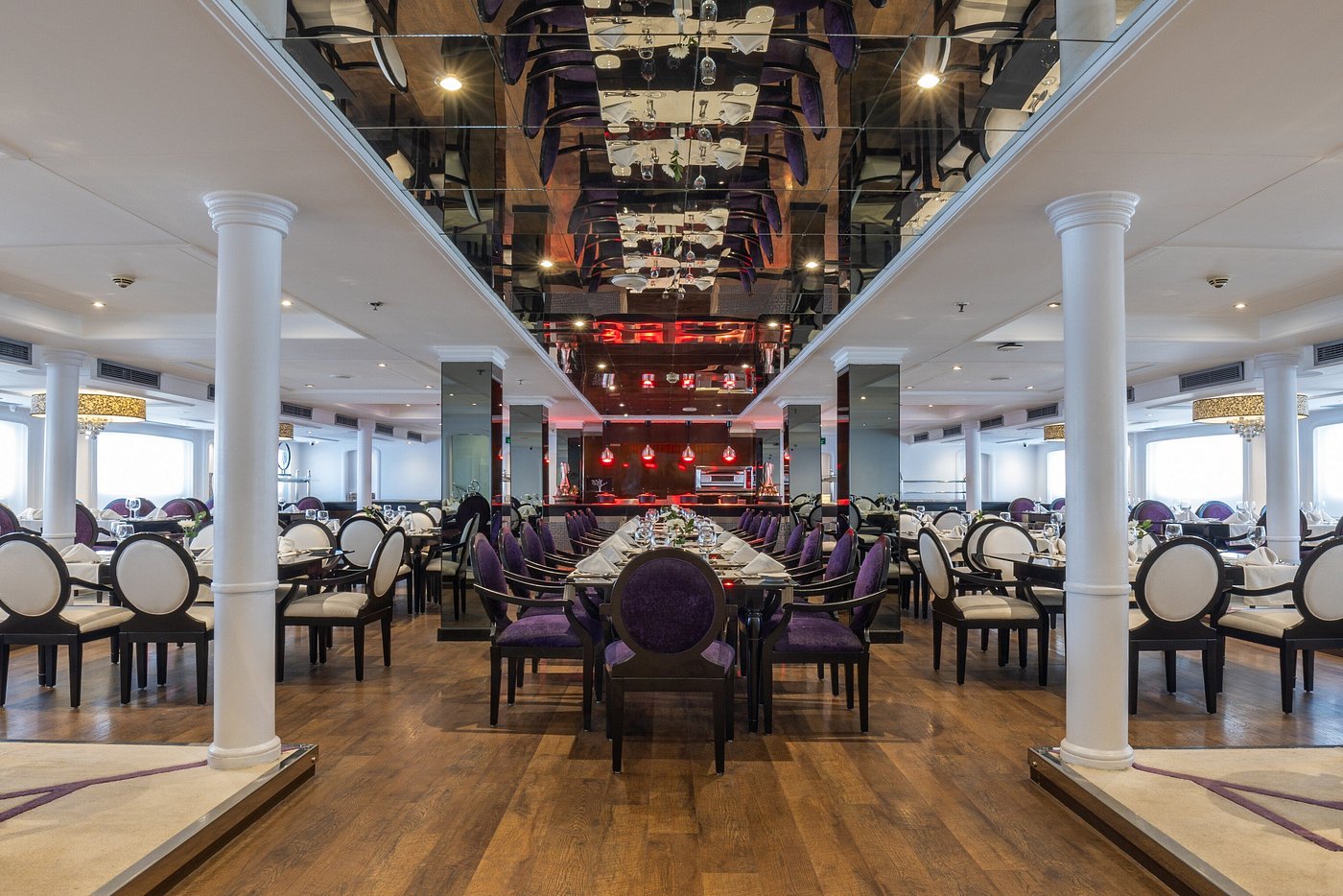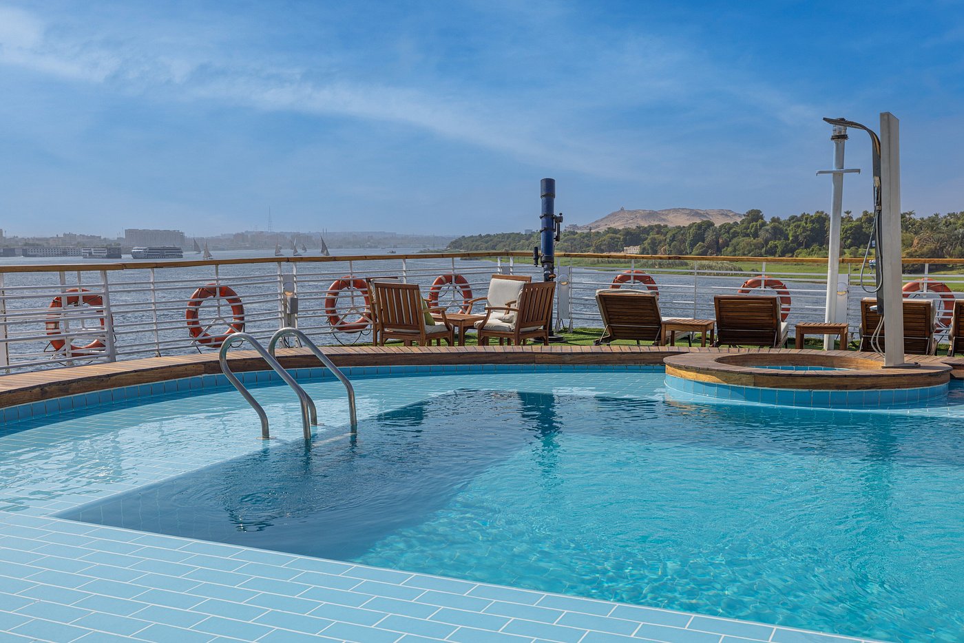 Farah is a luxury cruise ship that sails along the Nile River between Luxor and Aswan in Egypt. It offers 56 deluxe cabins and 2 Royal Suites, all outfitted with handmade Egyptian cotton sheets and handmade furniture. The ship offers a variety of facilities and amenities such as a large swimming pool on its sundeck, ample indoor and outdoor lounge spaces, a library, a restaurant and bar, a gym, a spa including a steam room and sauna, a hairdresser, and more.