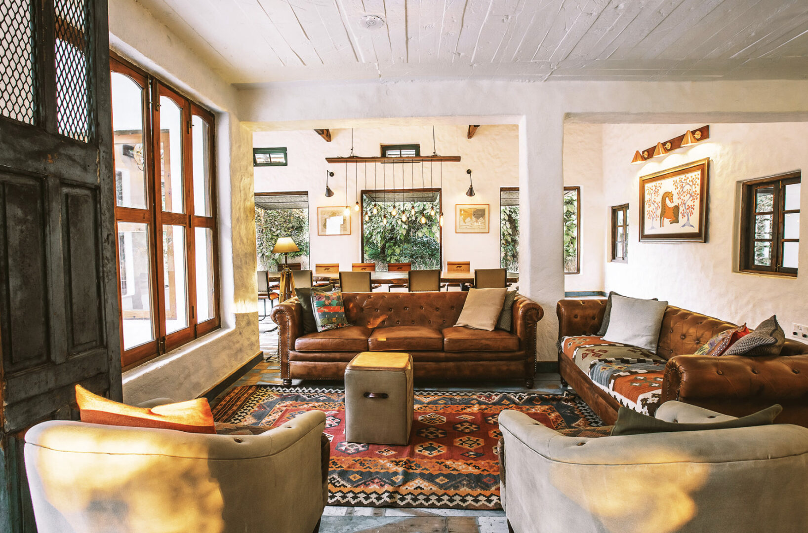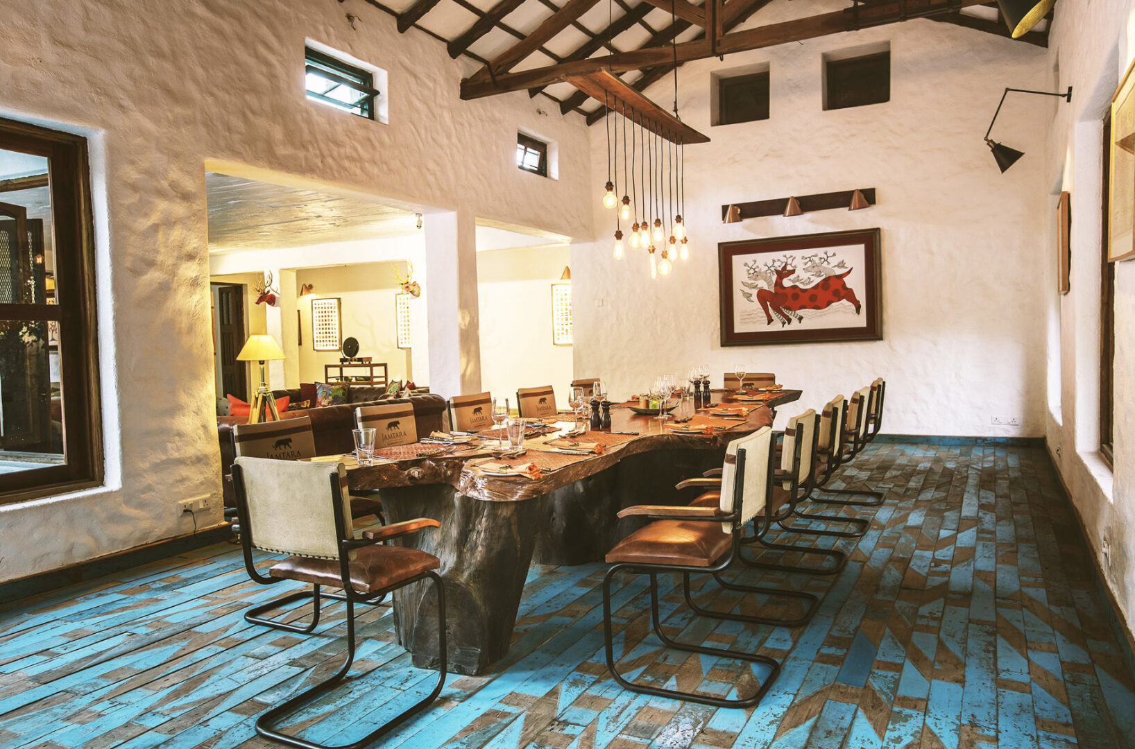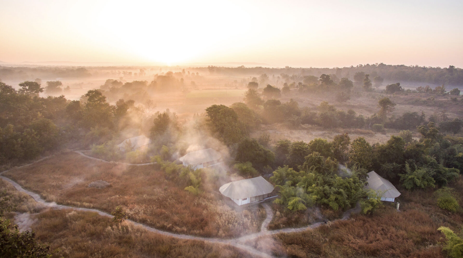 Inspired by an ancient banyan tree and built to cause the least impact to the surrounding environment, Jamtara Wilderness Camp was built to provide an unforgettable experience with sustainability as its cornerstone. Jamtara provides for the ideal atmosphere to relax, whether it's birdwatching, taking a swim in the infinity pool, or unwinding with a drink under the stars. 10 luxury tents make up the camp, each designed to allow an optimum view of nature. With the option of rolling up the front panels of the tent, the guests can lounge on the patio, which overlooks a dry river bed.