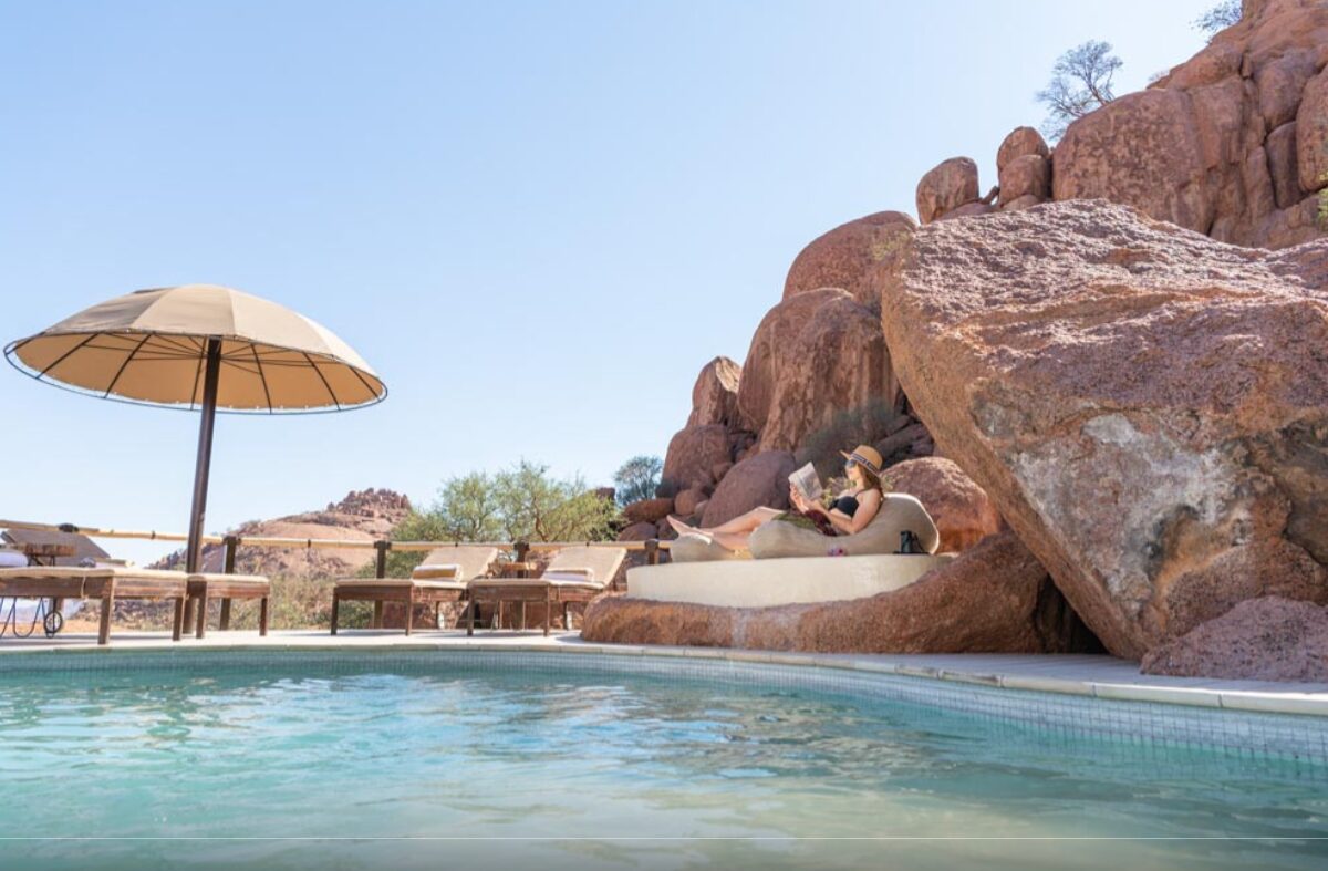Onduli Ridge is a boutique luxury camp set amid granite boulders in the Doro !Nawas Conservancy in Namibia’s Damaraland. The lodge comprises six elevated suites, each featuring a king-size climate-controlled bed, a partially open-air bathroom with rain shower and flush toilet, and a private deck where the bed can be rolled outside for starlit sleep. Facilities include a communal lounge, library, dining room and bar, an infinity-edge swimming pool set into the rock, and a wildlife-viewing waterhole adjacent to the camp for unobstructed sightings. The setting offers sweeping views of Namibia’s highest mountain, the Brandberg, and the remote arid plains beyond the granite ridge.