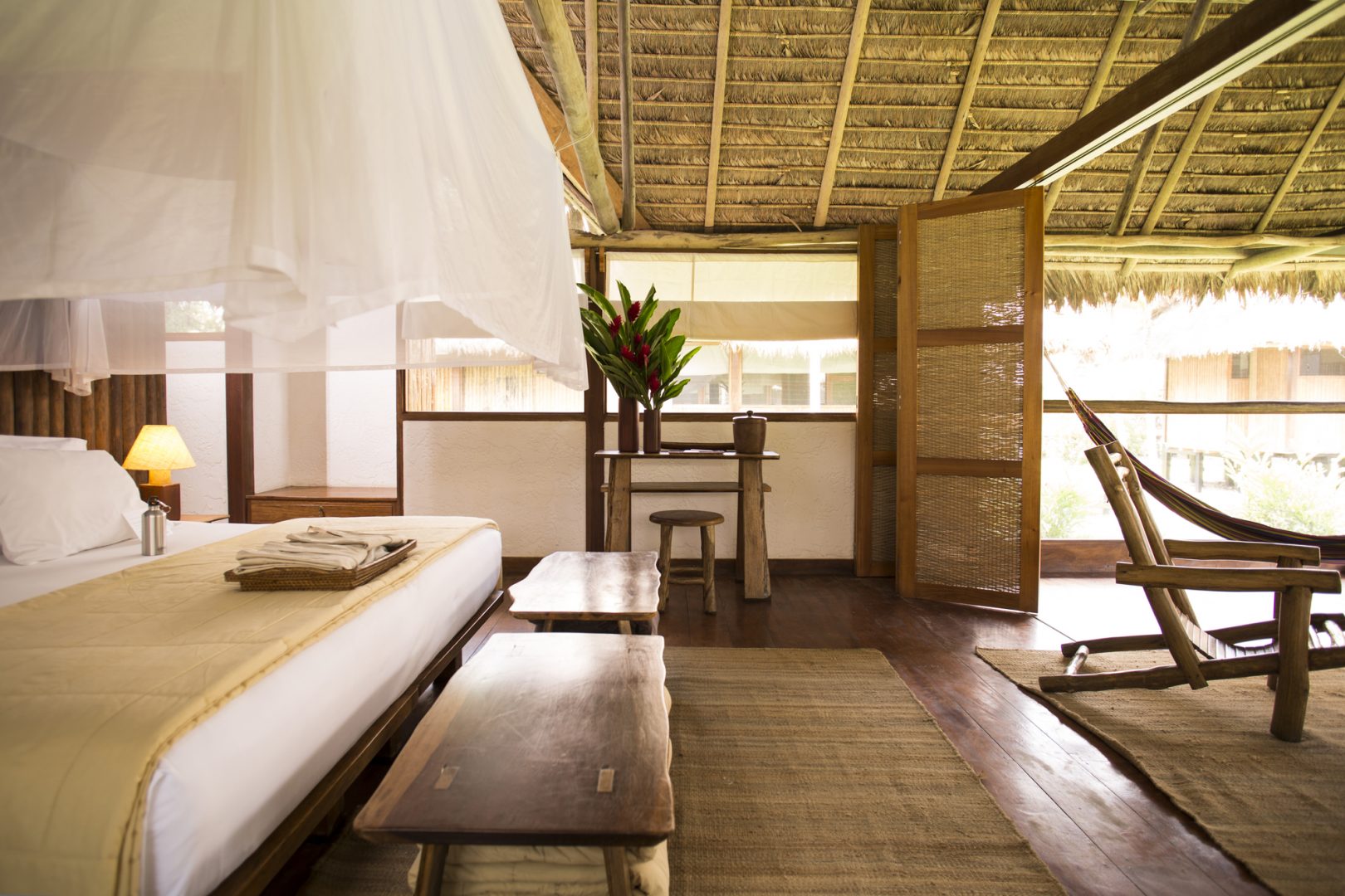 The Inkaterra Reserva Amazonica sits at the edge of a private ecological reserve on the banks of Peru's Madre de Dios River. It features 35 thatched-roof cabanas with terraces and hammocks. For a truly unique experience, the Inkaterra Canopy Walkway, a bridge system 90 feet above the ground, allowing adventurers to enjoy a privileged view of the Amazon.