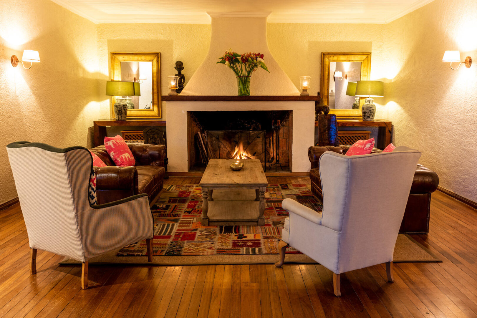 All guest cottages are discretely situated amongst the hills and the verdant vegetation of the Sabyinyo property. Each beautifully appointed ensuite cottage, with its country-chic style and open log fires, is a perfect haven of warmth and luxury. The main lodge building is designed with the guest in mind. Assorted seating areas in the main lounge, reception and entertainment room provide for intimate privacy, or the opportunity to meet other guests, and fireplaces throughout create a luxuriously warm and inviting atmosphere.
