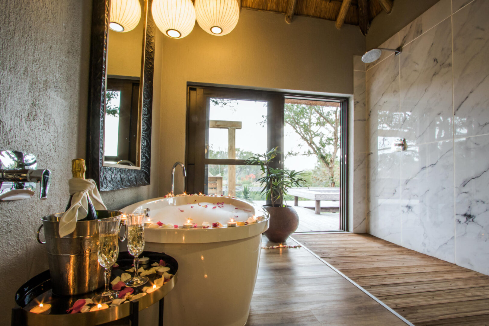 Guests at Simbambili Game Lodge enjoy a boutique, personalized experience with just 8 total safari suites. The lodge offers comfortable common areas, well-appointed viewing decks, and private plunge pools in each suite. There is also an onsite spa and a small exercise room.