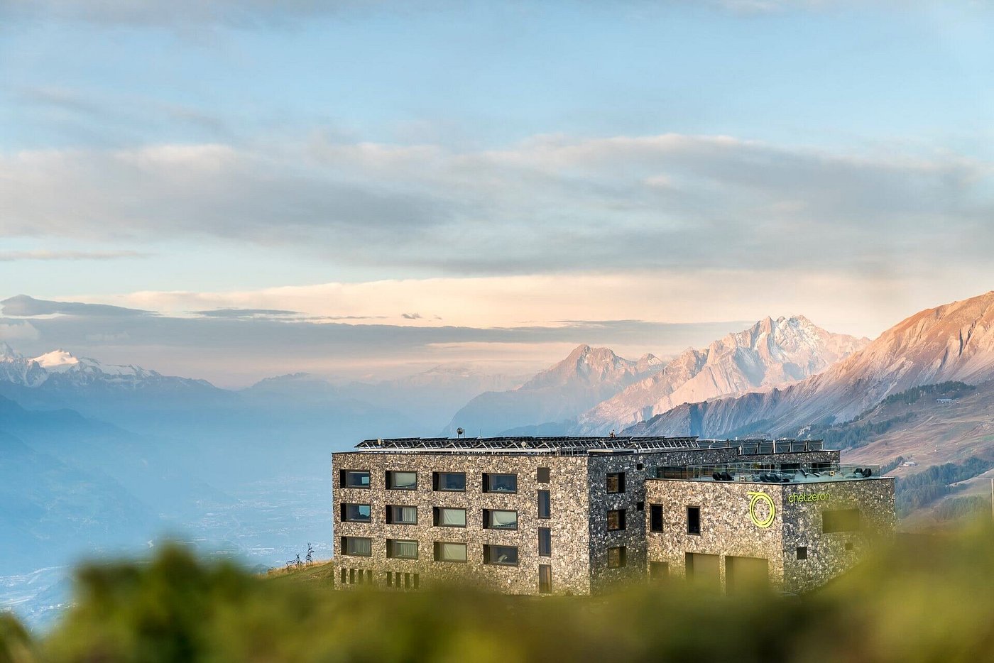 The Chetzeron Hotel is an architectural masterpiece at 2112 meters above sea level, high above the Rhone Valley with a magnificent view from the Matterhorn to Mont Blanc. The former mountain station has been converted into a boutique hotel with the Minergie-Eco standard, with 16 junior suites and rooms in an urban-alpine style, a spa area, meditation room, lobby with fireplace, bar and 3 restaurants, and of course a ski-in and ski-out experience in winter.