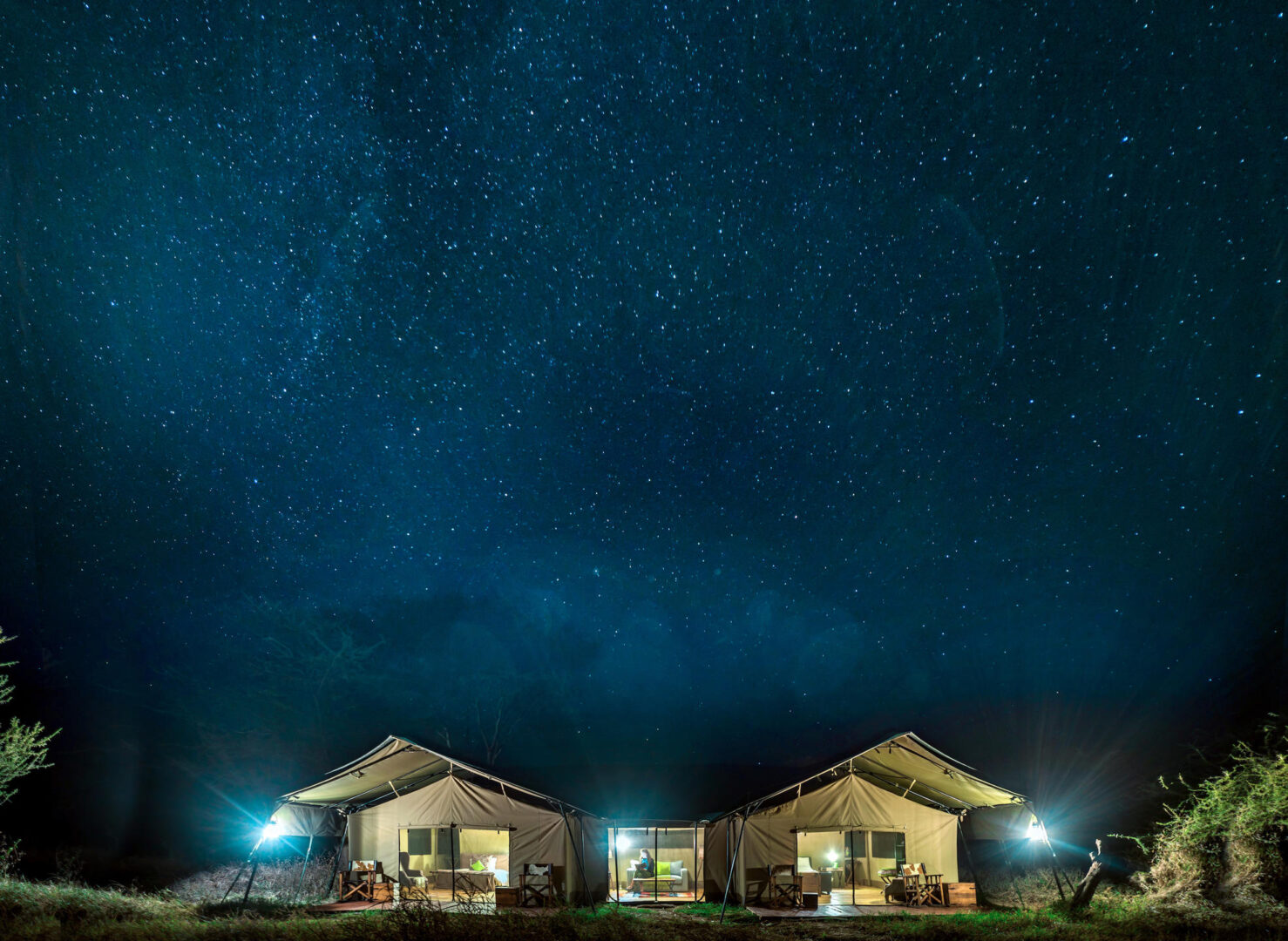 Each of the en-suite tents has 2 Queen beds and features an outside deck with loungers overlooking the surrounding nature. The dining tent includes a separate bar, and there are sitting and dining areas in the main tent with cozy leather sofas. Guests can enjoy a scenic sundowner outside, then end the night relaxing around the campfire.