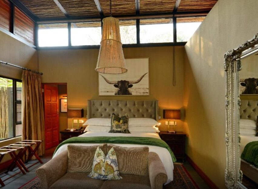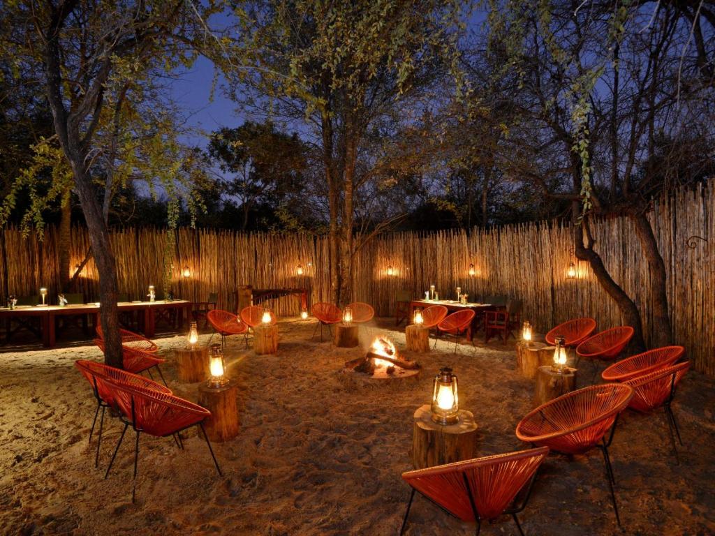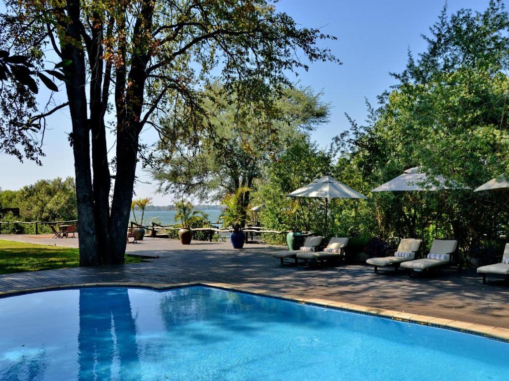 Mukwa Lodge is a luxury retreat set along a tranquil stretch of the Zambezi River near Livingstone. The lodge offers spacious suites and an island villa, each with a private plunge pool, outdoor shower, and expansive deck overlooking the water. Facilities include a riverside dining area with open fireplaces, a heated lap pool, a bar and lounge, and a small spa tucked into the gardens. The setting provides uninterrupted river views and frequent sightings of elephants and other wildlife along the opposite bank.