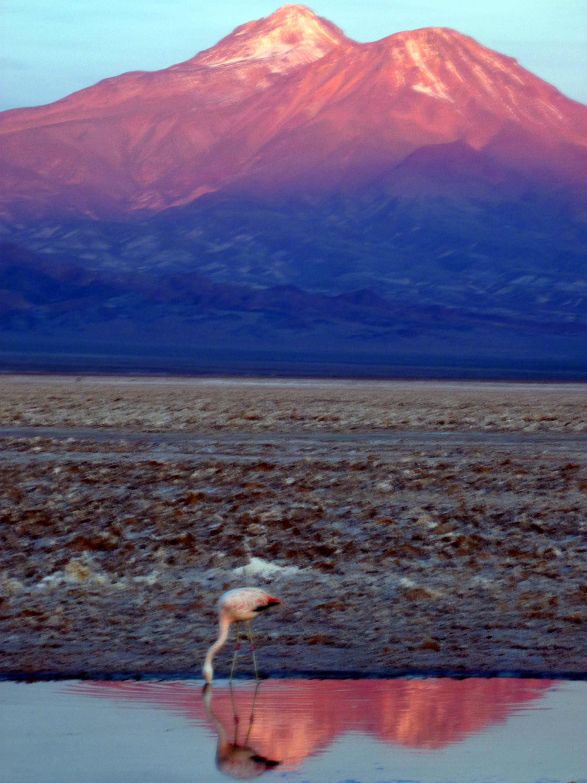 The Salar de Atacama is home to a protected flamingo reserve. I watched an intense pink and lavender sunset reflected in the Chaxa Lagoon as the long, elegant bodies of Andean flamingos, the rarest flamingo in the world, quietly grazed in the salty water for microscopic algae.