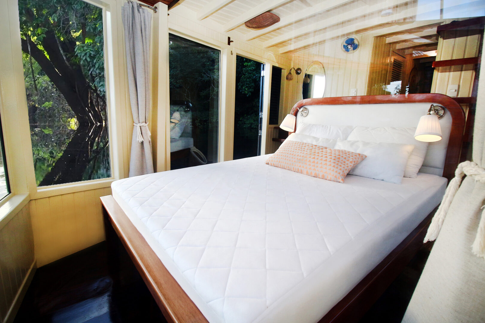 This quaint private boat sleeps a maximum of four passengers, with one suite with a double bed and a twin suite with two twin beds. Refurbished in 2023, this charming boat has comfortable amenities such as air-conditioning, luxury toiletries in the ensuite bathrooms, a shaded rooftop lounge area, two kitchens, and a dining room. Onboard crew will make your voyage comfortable, and a private guide will create an immersive, bespoke experience.