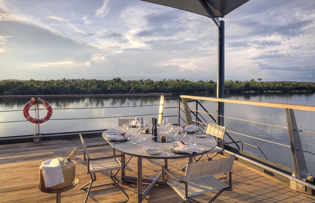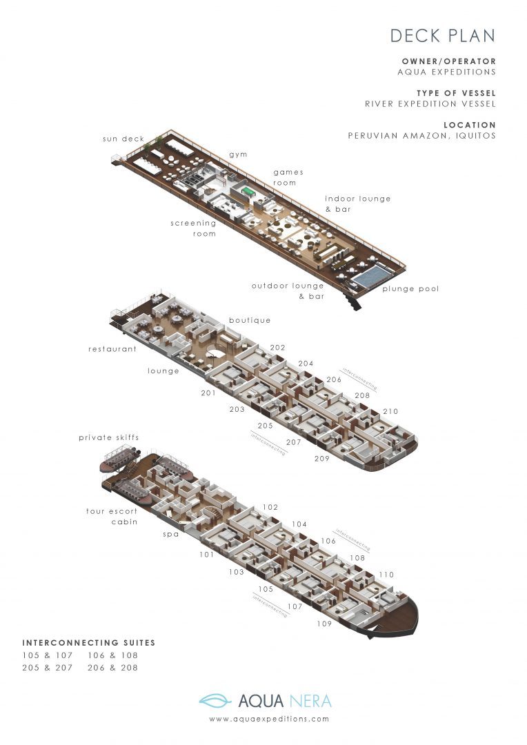 The Aqua Nera was designed for Aqua Expeditions by award-winning architect Noor Design who drew inspiration from the peaceful blackwater lagoons and tributaries of the Mirrored Forest in the Peruvian Amazon. The Aqua Nera offers luxury cruise expeditions on the Amazon River. This river cruise ship has 20 spacious, air-conditioned suites with floor-to-ceiling windows, accommodating a maximum of 40 passengers. Amenities include an indoor lounge, outdoor lounge with pool, fitness center, observation deck, and a dining area featuring gourmet Peruvian cuisine. There are four launch boats for shore excursions, plus kayaks and all-terrain bikes on some itineraries.