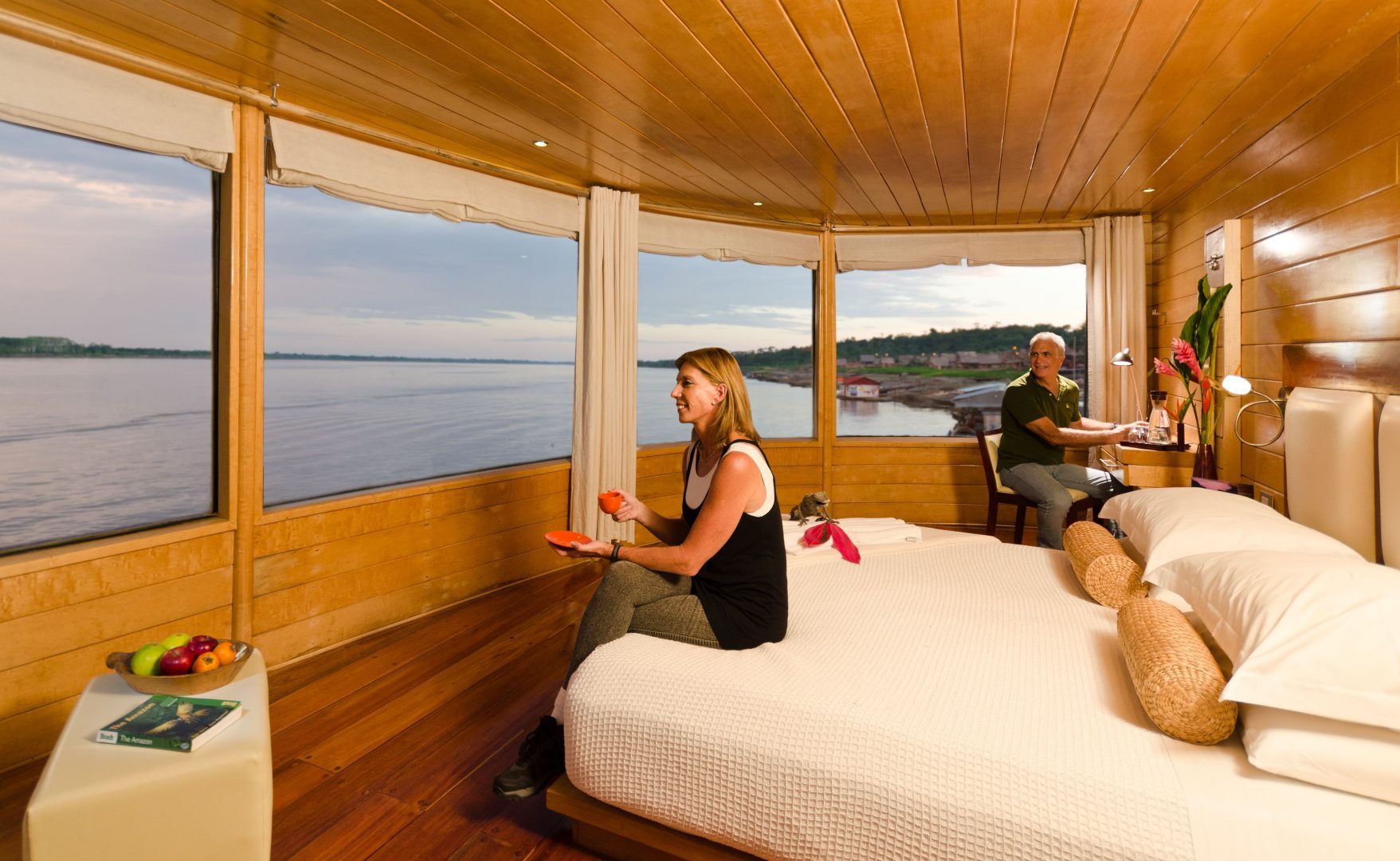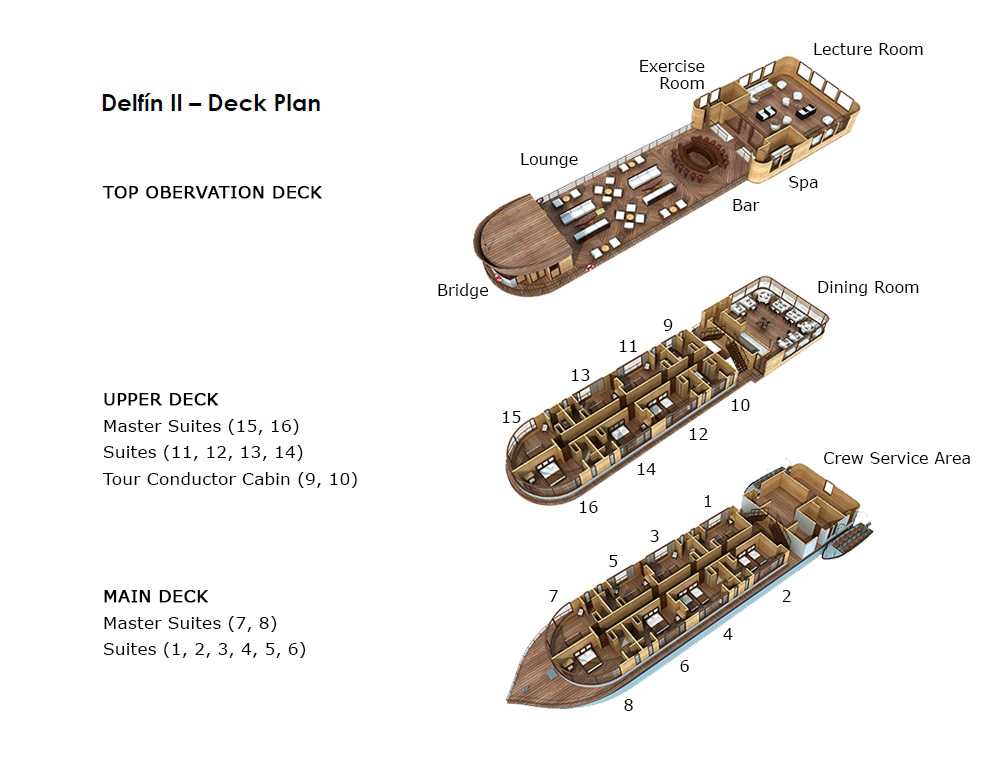 4 Master Suites at the front of the boat, 180-degree panoramic windows 10 Suites on the main and upper deck All suites have private bathrooms and air conditioning. All suites are equipped with one king bed or two twin beds.