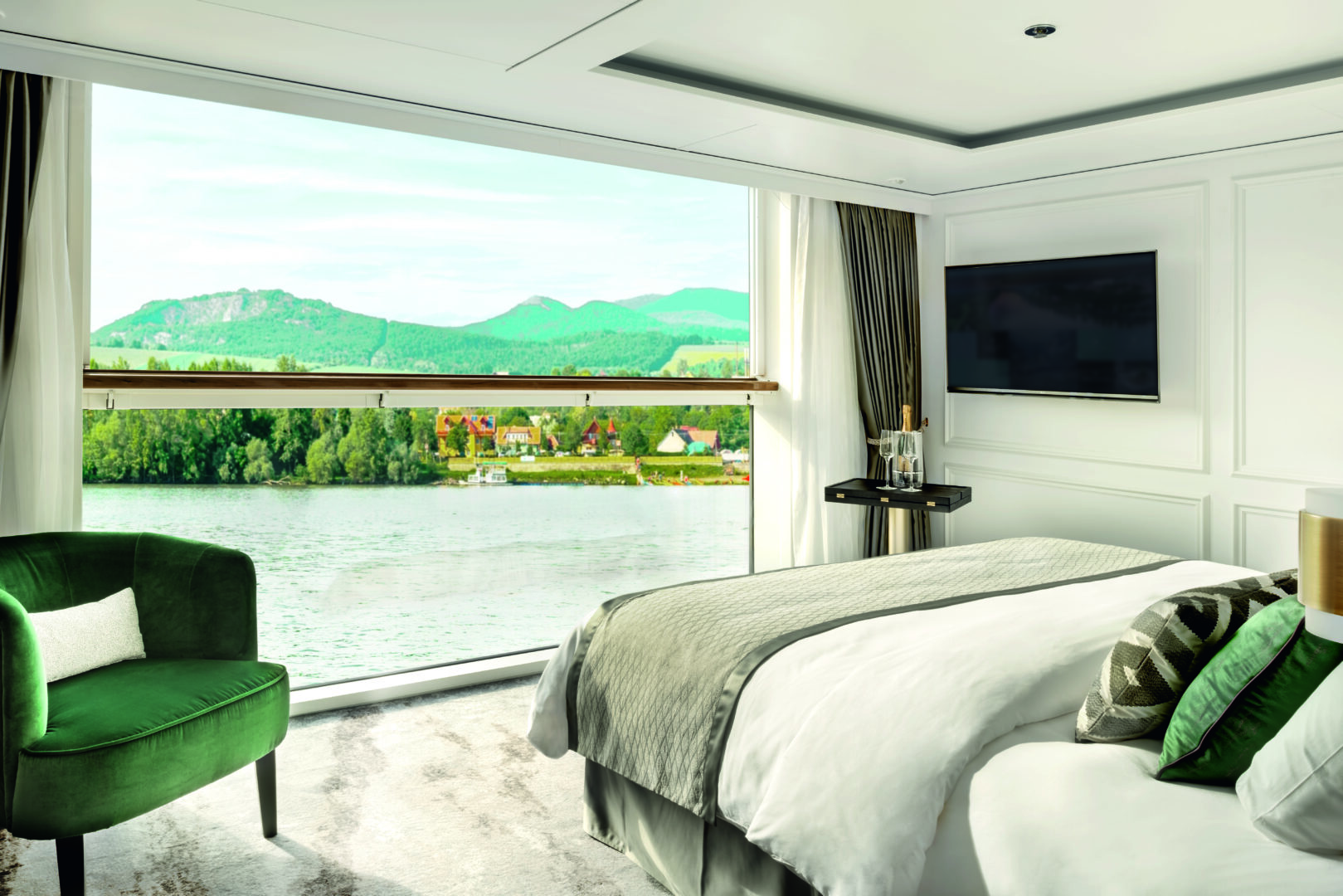 The Riverside Ravel is a luxury riverboat in France, cruising on the Rhône and Saône rivers. This chic boat offers luxe suites with floor-to-ceiling windows, a restaurant serving 5-star French cuisine relating to the regions it sails through, ample lounge areas to view the passing riverbanks from, an indoor swimming pool, and a state-of-the-art spa and fitness center.