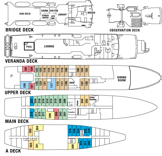 • Accommodations: 54 outside cabins with private facilities; 2 suites with private facilities