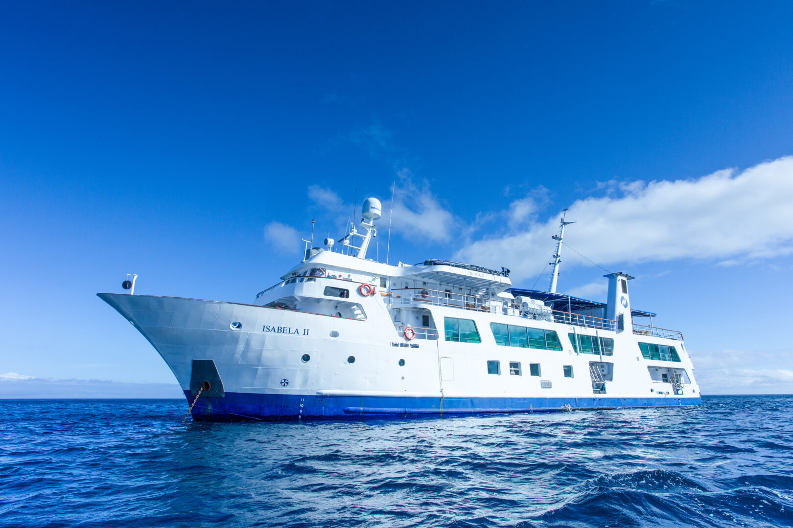 The Isabela II is a 40-passenger first class yacht. This stylish boat is fully air conditioned and offers ample social areas on its three decks, including a bar and lounge, dining room, and a sun deck with a bar, Jacuzzi, and solarium. The ship also has a glass-bottom boat, providing additional opportunities to observe the local marine life. With three high quality naturalist guides aboard, the Isabela II is an elegant and inviting way to explore the Galapagos.