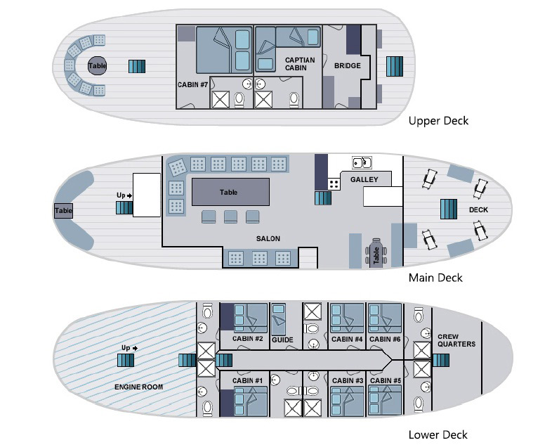 • Crew: Captain, mechanic, cook, 1 naturalist guide, plus 3 crew members