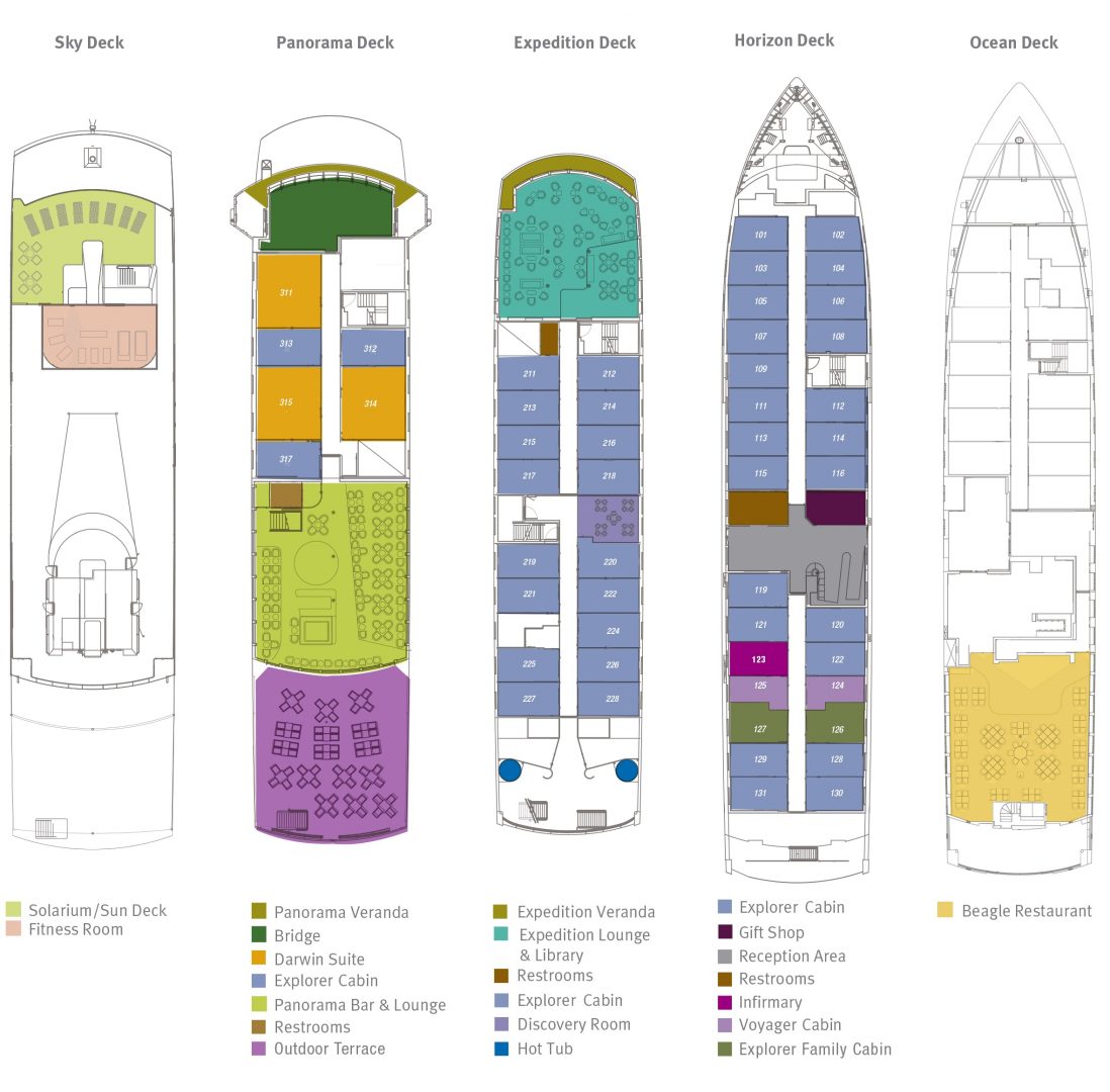 The Santa Cruz II has 50 cabins accommodating 90 guests. The ship offers large indoor and outdoor social areas, including a library, bar and lounge, barbecue and al fresco dining, and sun deck with Jacuzzi. The ship has multiple lecture areas for nightly activities and seminars. The Santa Cruz II has an average of 11 guests per guide, one of the best guest-to-guide ratios in the islands. Meals are planned by a Cordon Bleu trained gastronomy director. Activities include excursions in the glass-bottomed boat, kayaking, hiking, and snorkeling.