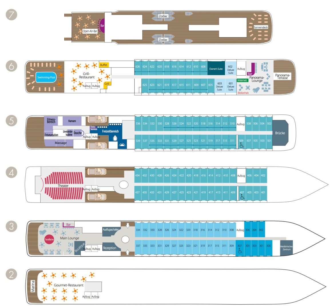 Staff & Crew: 140 Guests: 264 Length: 466 feet Width: 59 feet Draft: 15.3 feet Cruising Speed: 14 knots Ice Class: 1C Gross Tonnage: 10,992
