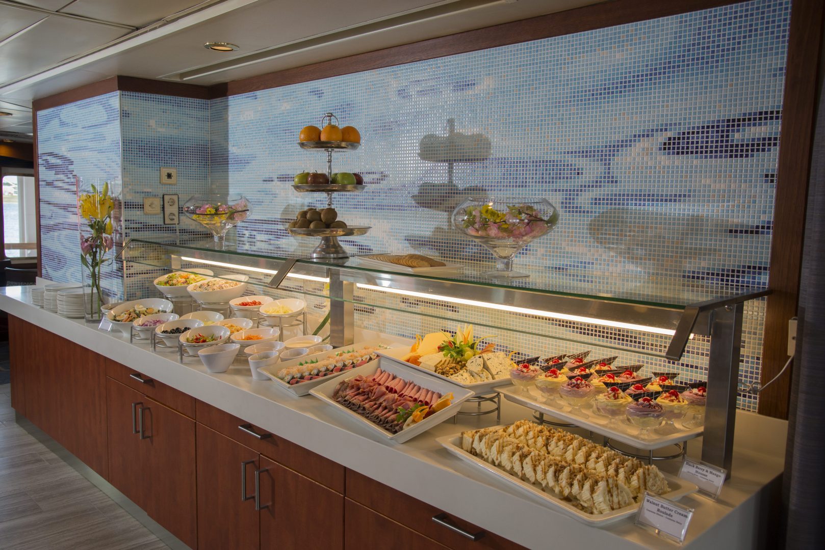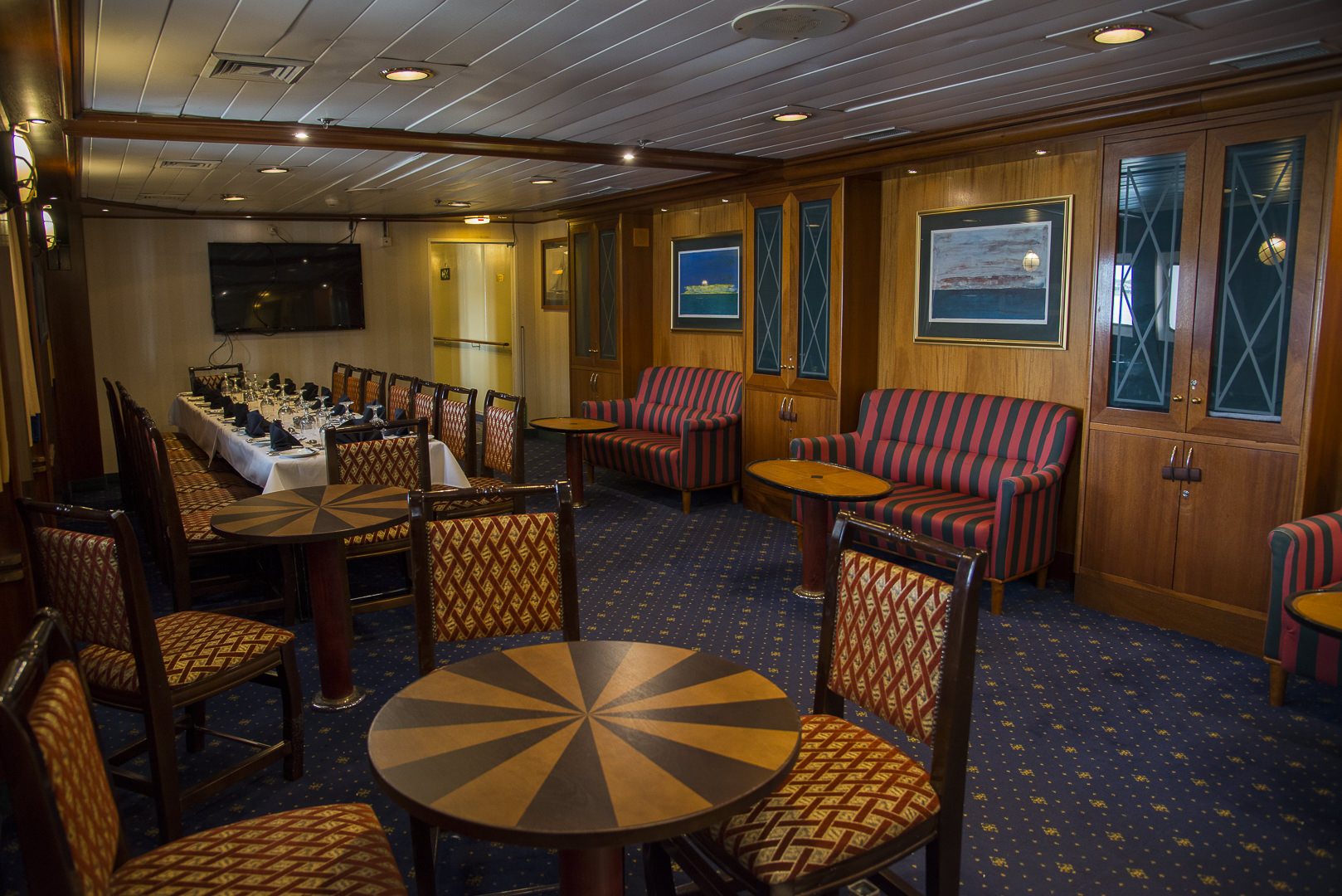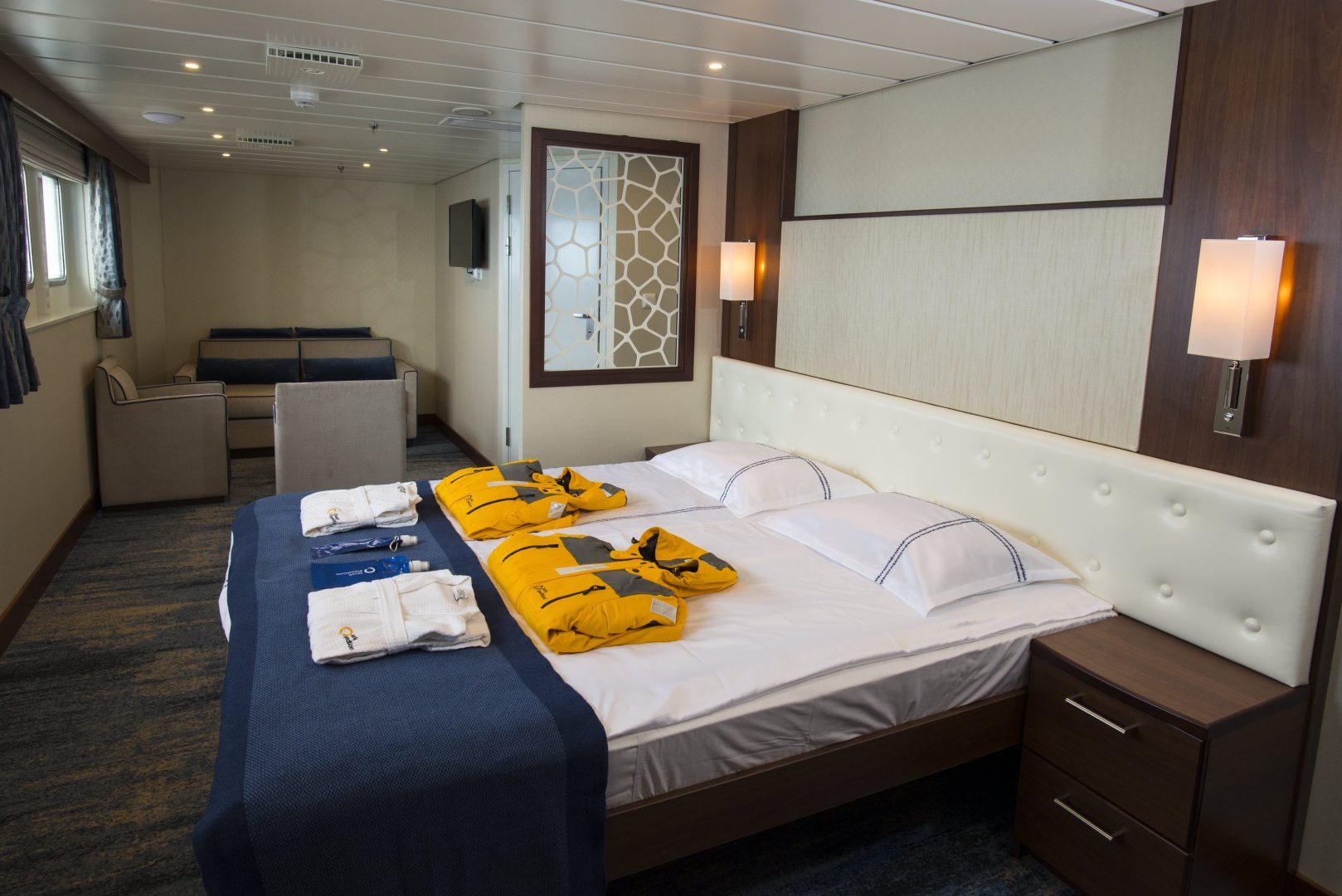 Owner’s Suite: Averaging approximately 244 sq. ft. (22 sq. m), an Owner’s Suite Cabin is equipped with one double bed made up of two twin berths. Located on the Bridge Deck, it has private facilities and windows with exterior views.