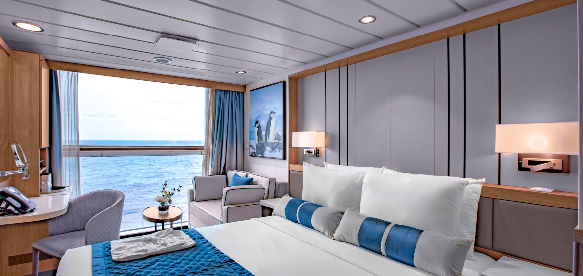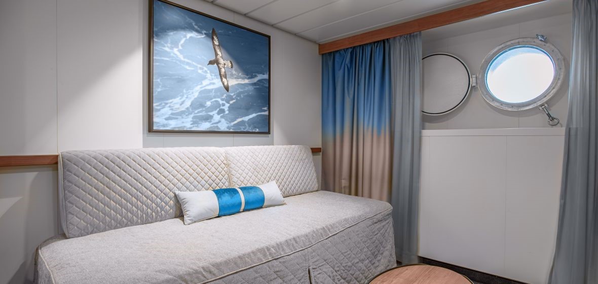 Junior Suite: Category A (452 sq. ft.) – The 4 junior suites aboard Ocean Victory have a great view from their location high up on the ship on deck 7. The suites feature a double bed or twin beds, sofa bed, seating area, a spacious bathroom and private observation deck. The cabin can accommodate up to 3 people. Located on the Amundsen deck 7.