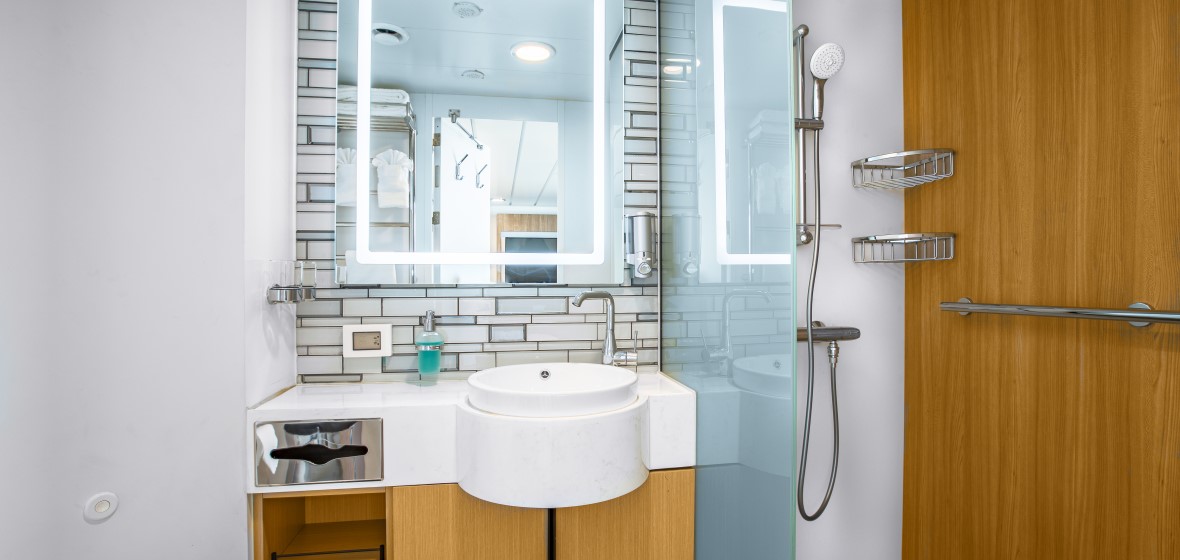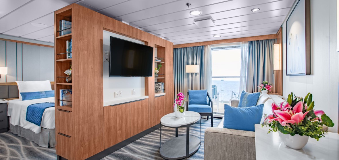 French Balcony Cabin: Category E (173 sq. ft.) – The French Balcony Suite is a standard cabin with a French balcony, a double bed, floor-to-ceiling windows and a bathroom. All French Balcony Suites are located on Deck 7.