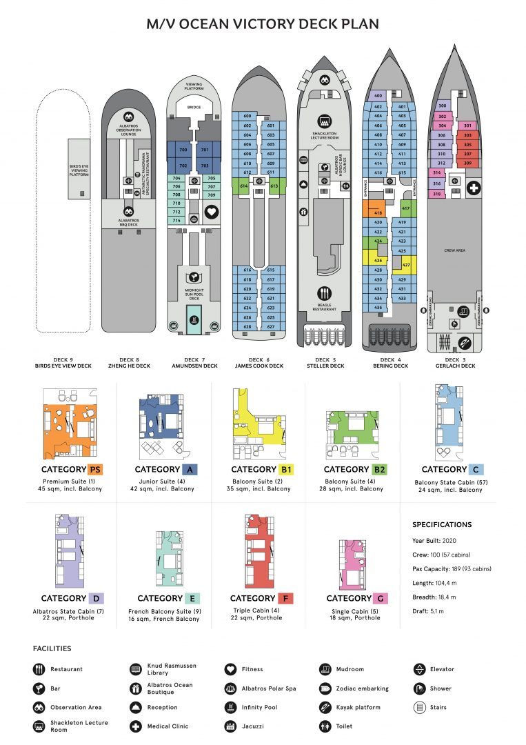Passengers: 189 Cabins: 93 Ice class: 1A (highest) Built: 2020 Crew: 100 Ice class: 1A Length: 104.4m Breadth: 18.4m Polar Spa / Wellness Area / Gym Dedicated single state rooms All staterooms with Ocean View 90% of all staterooms with Panoramic Balcony Restaurant on Deck 5 Observation Speciality Restaurant on Deck 9 Swimming Pool, Jacuzzies and Pool Bar