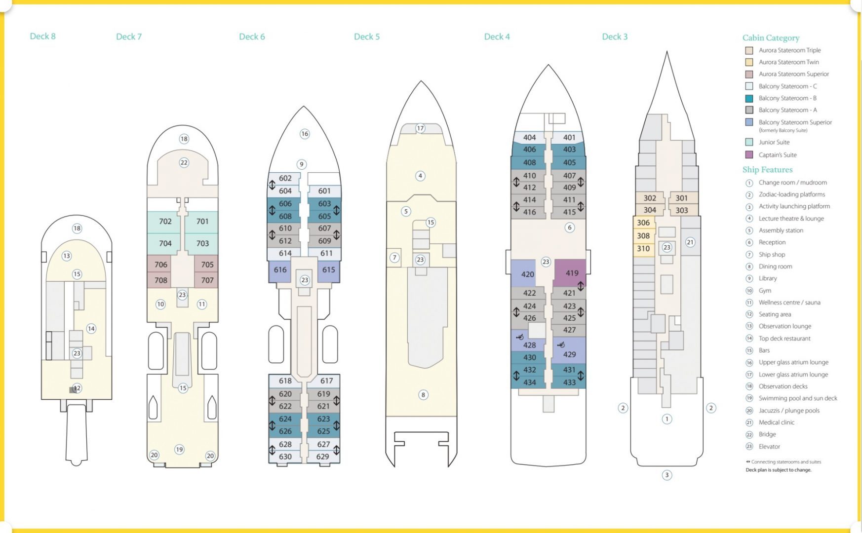 Balcony Stateroom Category A – The 23 Balcony Staterooms A premium cabins are the most abundant on board and found in preferred positions on Deck 4 and 6 which provide easy access between Decks via the internal stairs or elevator.