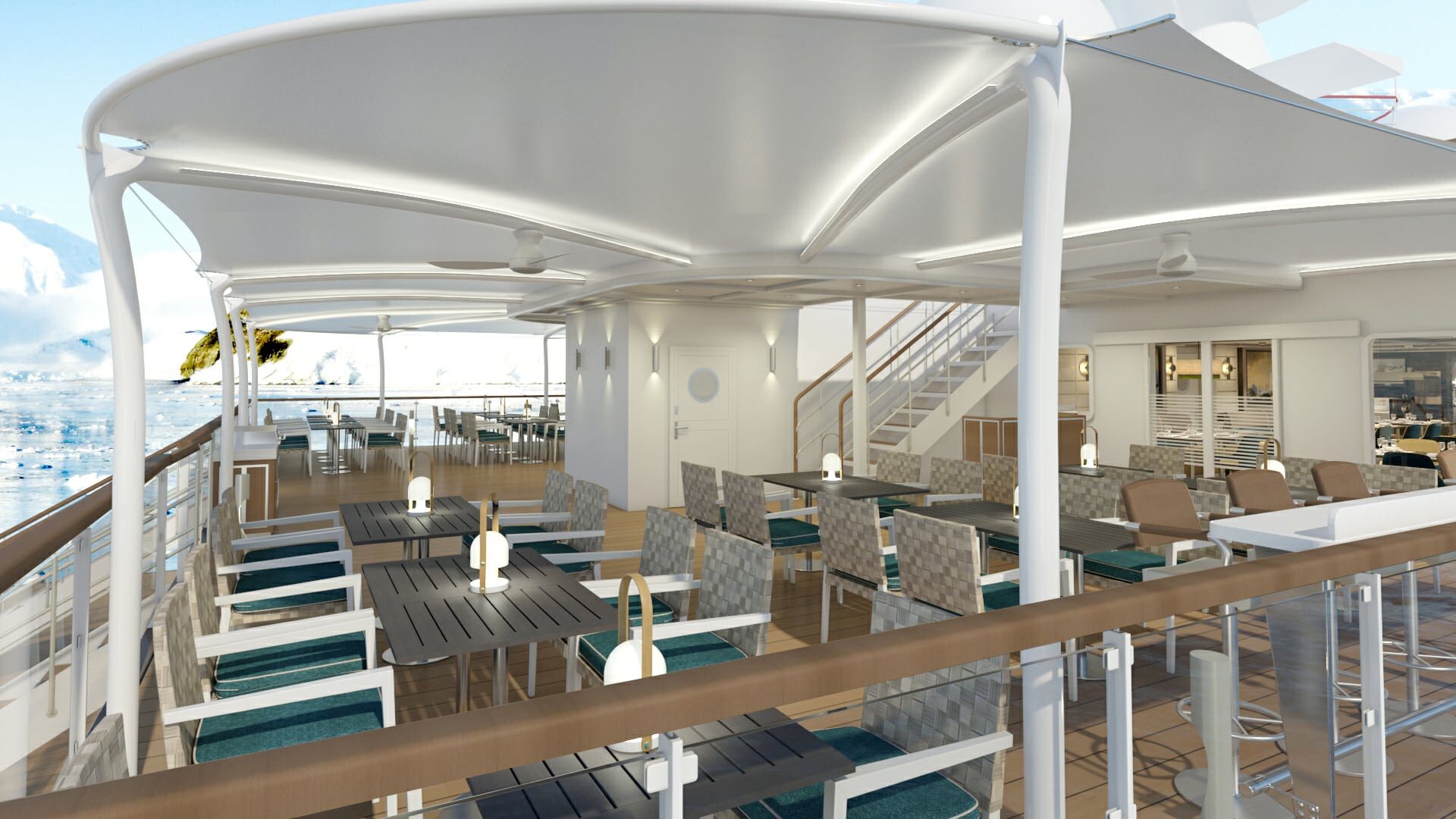 Aurora Stateroom Superior – With a bit more room to stretch the legs, the Aurora Stateroom Superior cabins are perfect for polar adventurers who travel with plenty of gear. Located on Deck 7, the Staterooms feature French balconies, floor-to-ceiling windows, ensuite bathrooms, and a comfortable desk area.