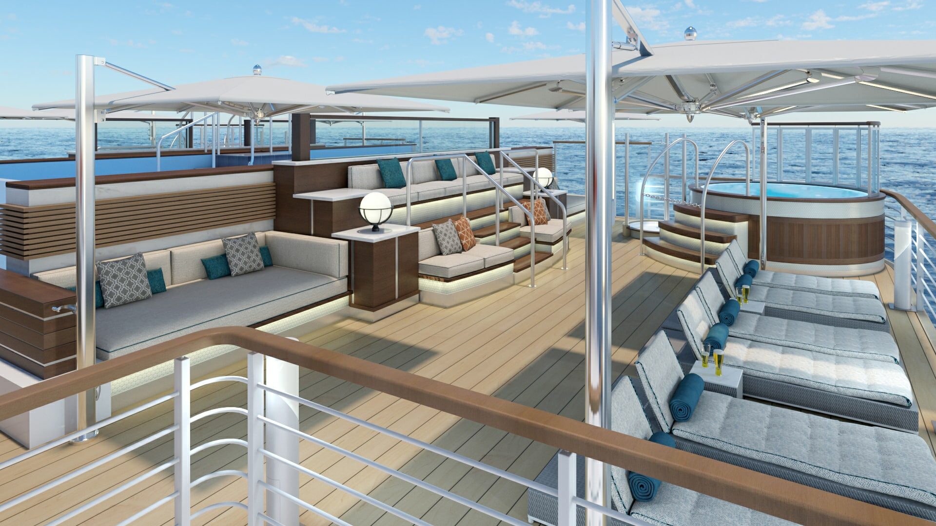 Junior Suite – The four Junior Suites take in some impressive scenery from their vantage points on Deck 7. When you aren’t enjoying a landing, you can relax in the suites’ separate lounge area, or just watch the world float by from the private balcony.
