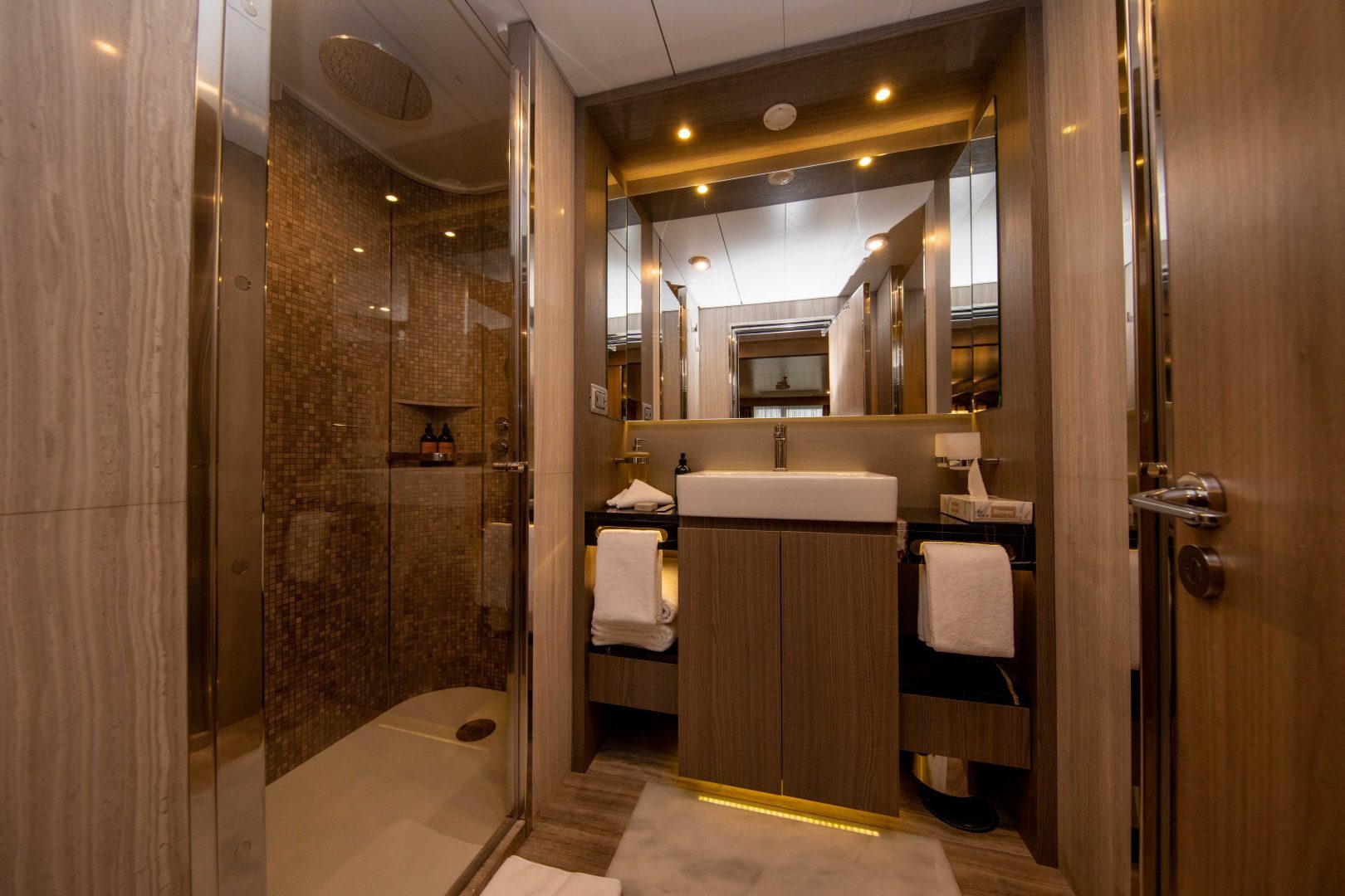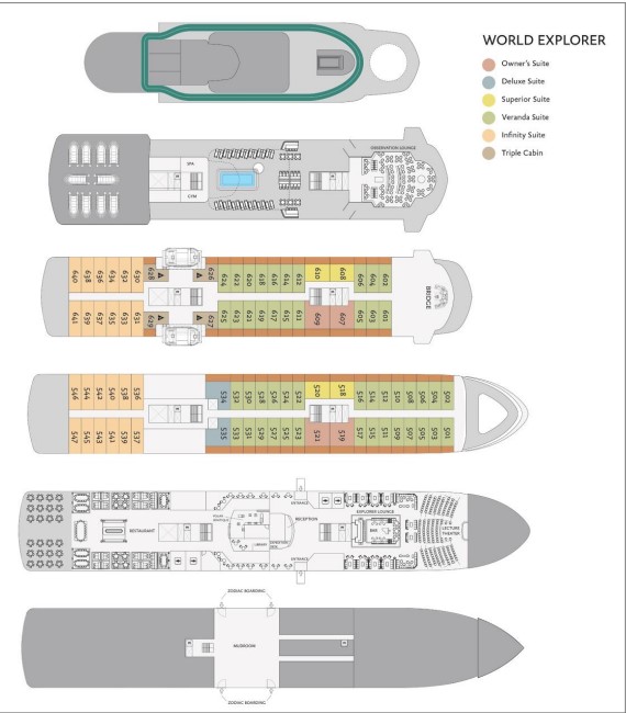Owner’s Suite: Located on Decks 5 and 6, and approximately 355 sq. ft. (33 sq. m) in size, these cabins have one double or two single beds, and a 110 sq. ft. (10 sq. m) walk-out balcony with access from sitting room and bedroom. A separate sitting area with sofa, refrigerator, TV, state of the art “infotainment” system, and private bathroom with shower, his & hers sinks, and bathtub is also featured in each cabin.