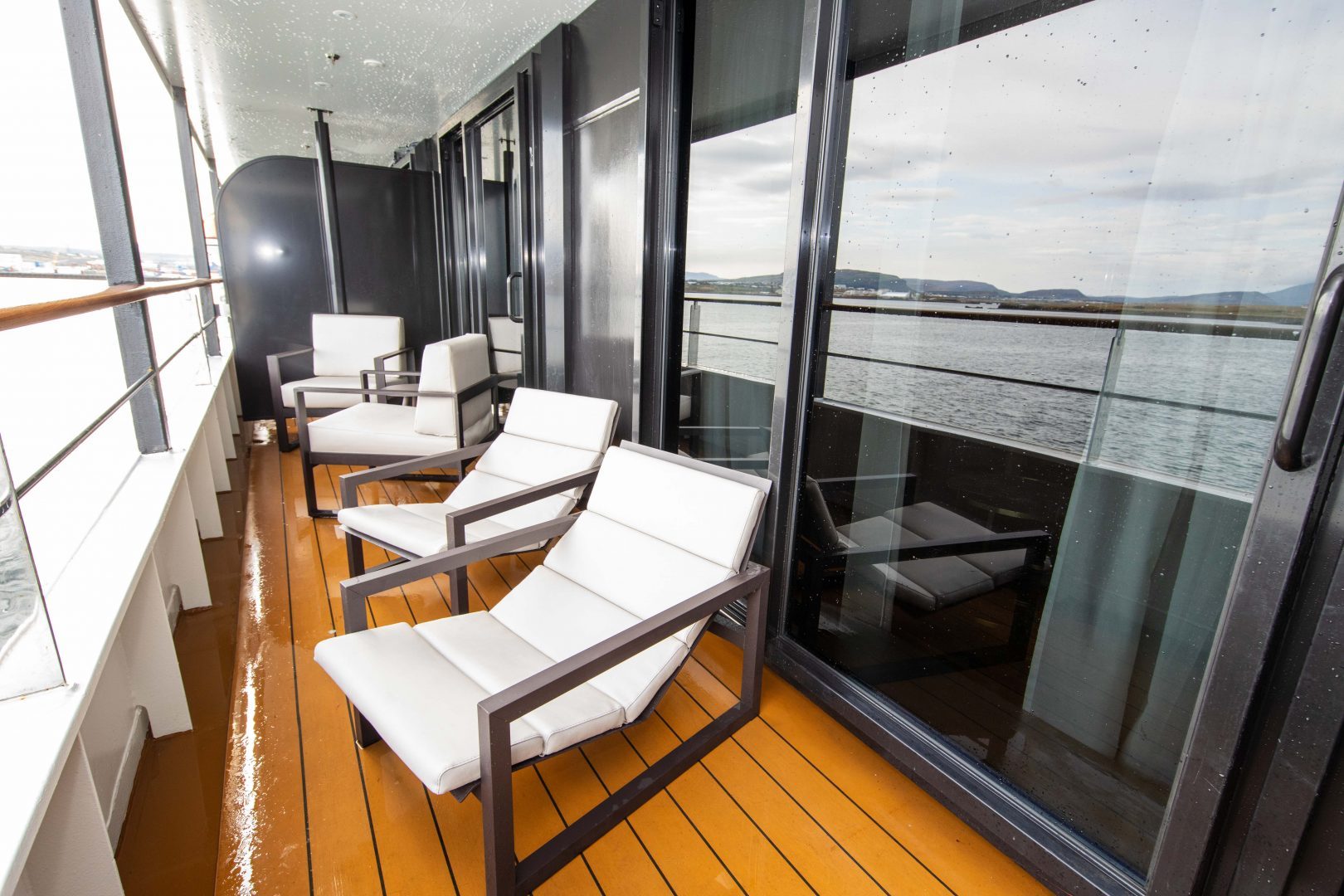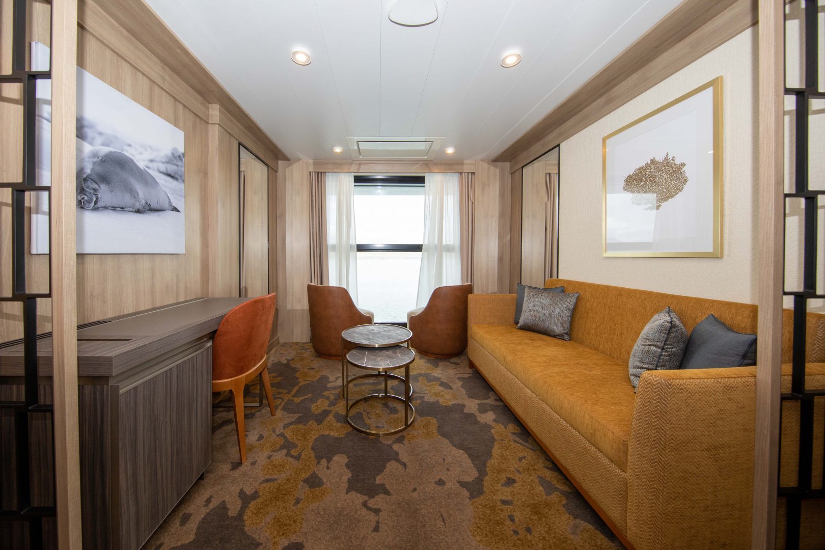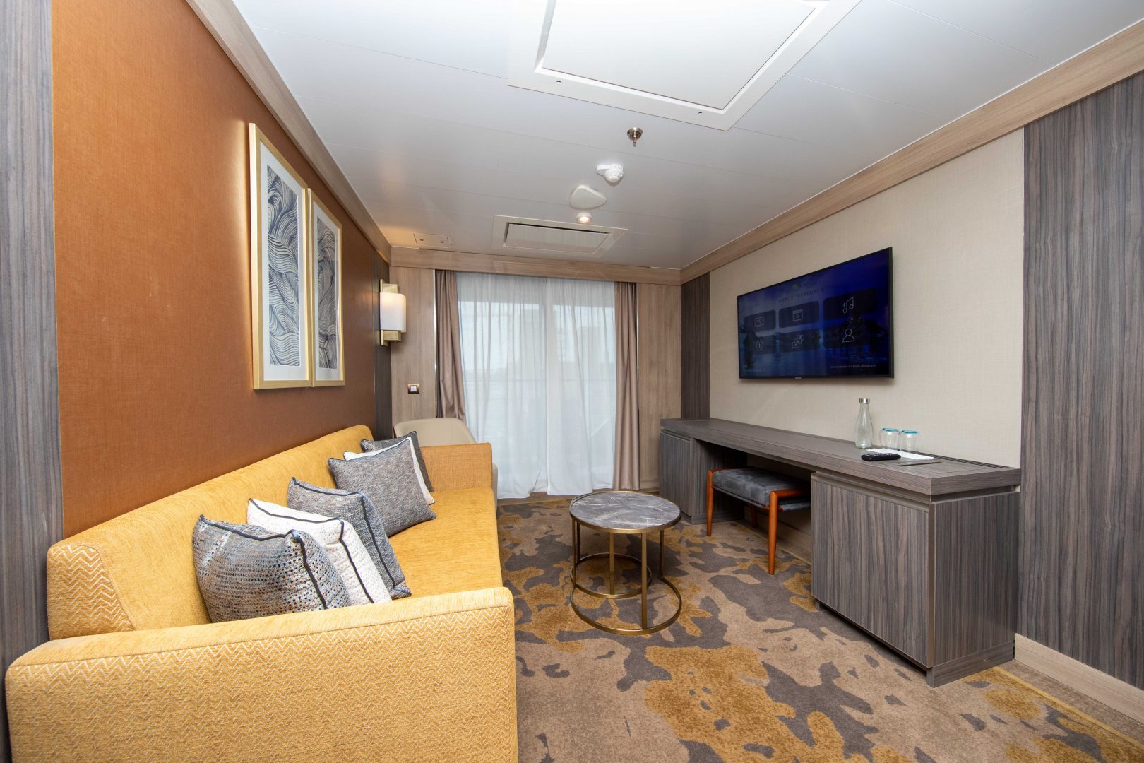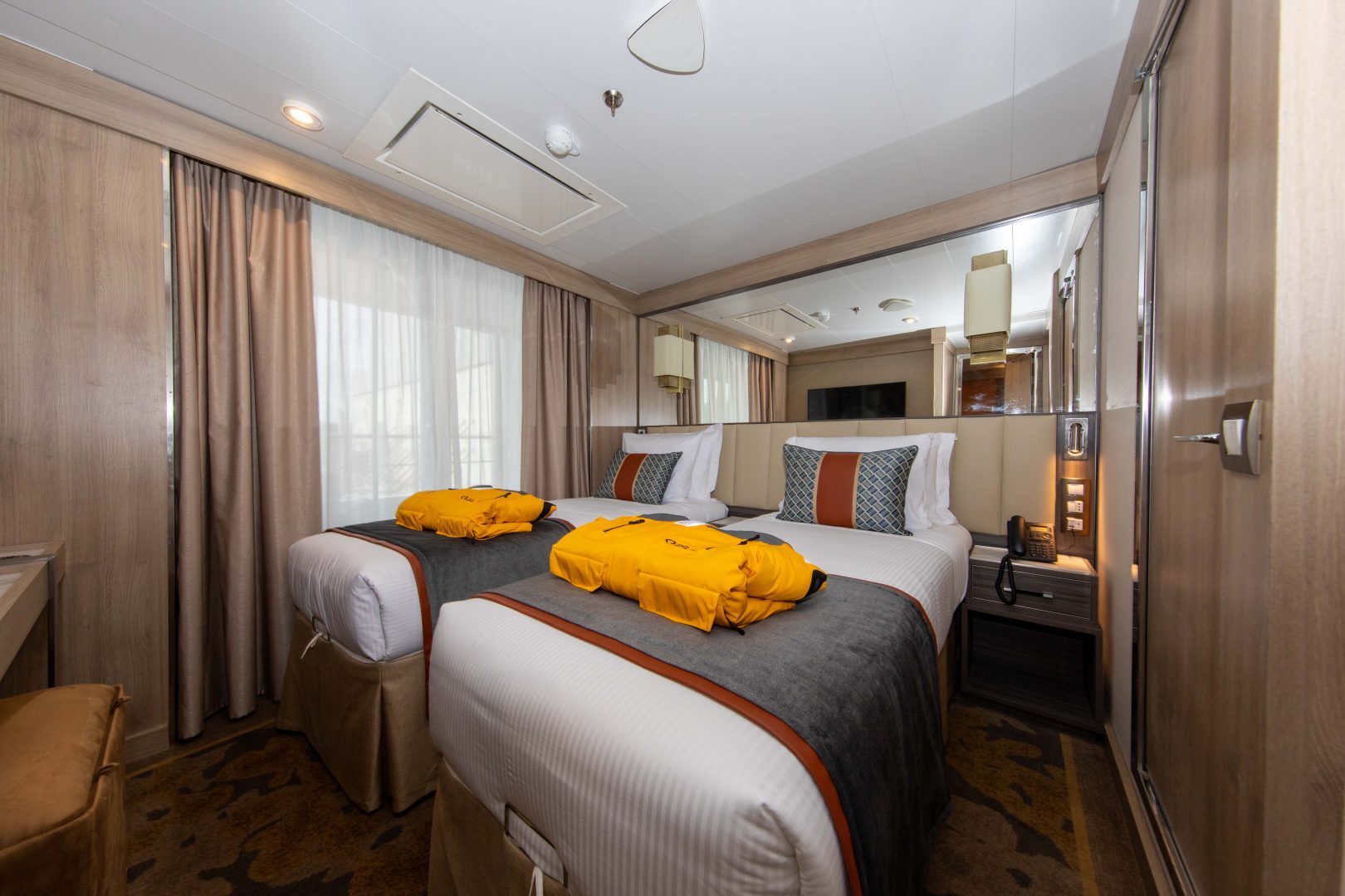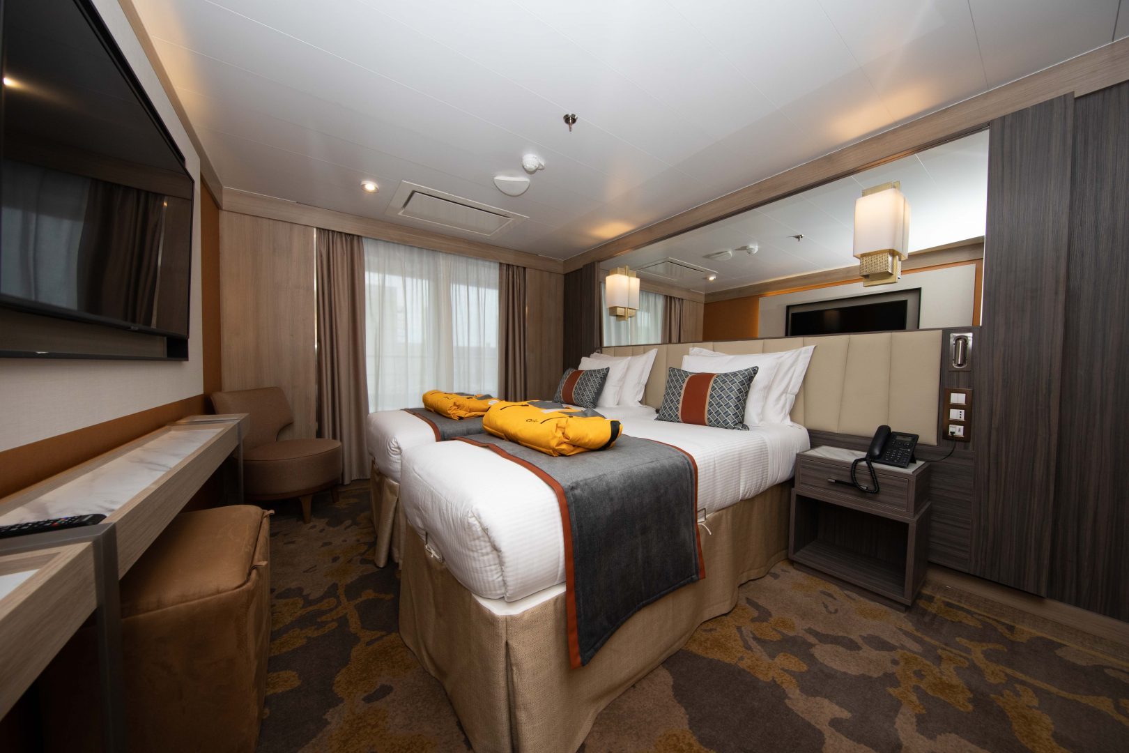 Superior Suite: Located on Decks 5 and 6, and approximately 278 sq. ft. (26 sq. m) in size, these cabins have one double or two single beds, and a 110 sq. ft. (10 sq. m) walk-out balcony with access from sitting room and bedroom. A separate sitting area with sofa, walk-in closet, refrigerator, TV, state of the art “infotainment” system, and private bathroom with shower is also featured in each cabin.