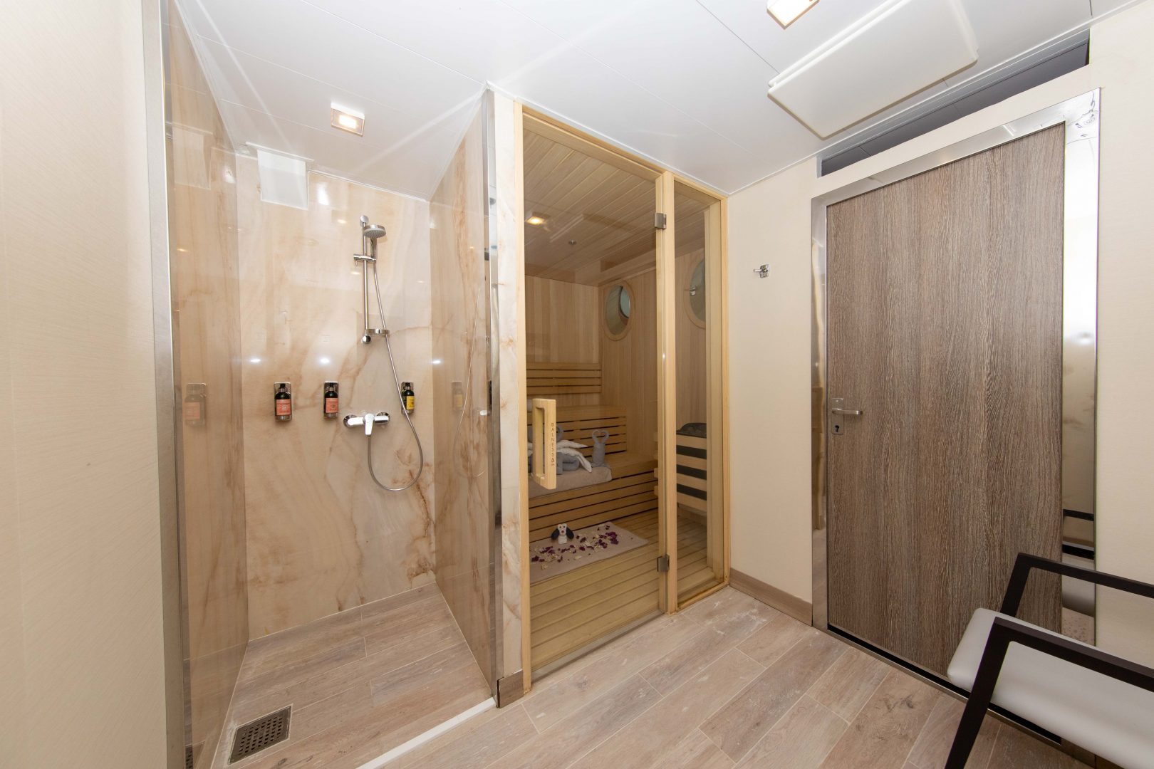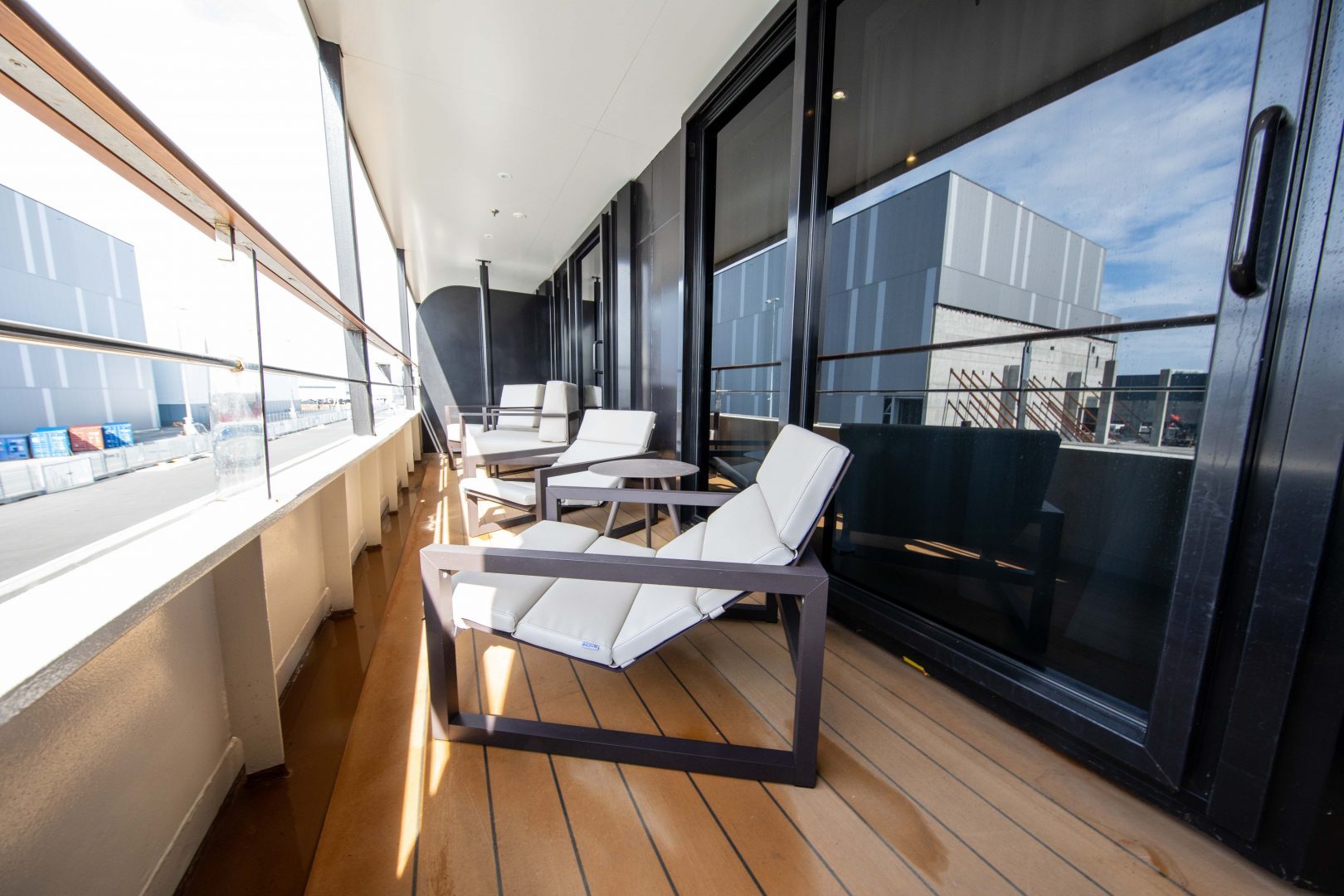 Infinity Suite: Located on Decks 5 and 6, and approximately 270 sq. ft. (25 sq. m) in size, these cabins have one double or two single beds, and a floor-to-ceiling glass Juliet balcony. A sitting area with sofa, refrigerator, TV, state of the art “infotainment” system, and private bathroom with shower is also featured in each cabin.