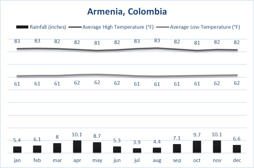The Coffee Region has a moderate climate with temperatures that vary little throughout the year, with an average temperature of 72 F year-round. The night time temperatures drop to an average of 61 F and during the day the average temperature reaches 82 F. Rain is also fairly constant throughout the year with rainfall 1 out of every 2 days but July and August tend to be drier months.