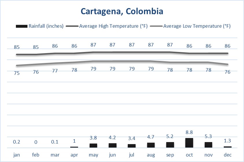 Cartagena and Santa Marta (on the Caribbean coast), by contrast, are more tropical, with average daytime high temperatures between 75 and 88 F.