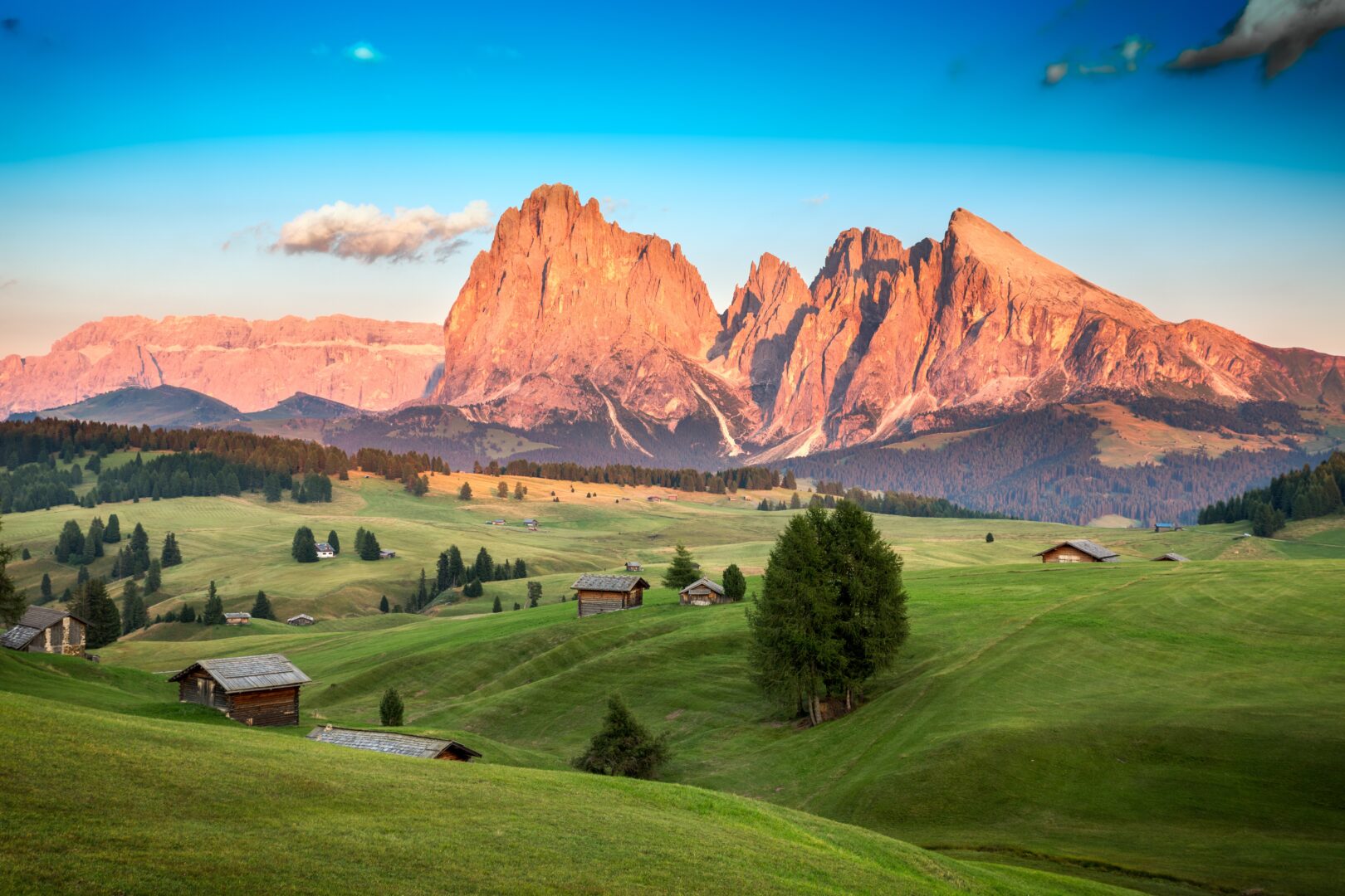Today’s hike takes you to the Seiser Alm, Europe’s largest high-altitude alpine meadow. Follow gentle trails across rolling pastures surrounded by the distinctive peaks of the Dolomites. The route passes traditional alpine huts, including Plattkofelhütte, where you can pause for a break and sample local specialties such as speck and homemade cheese.