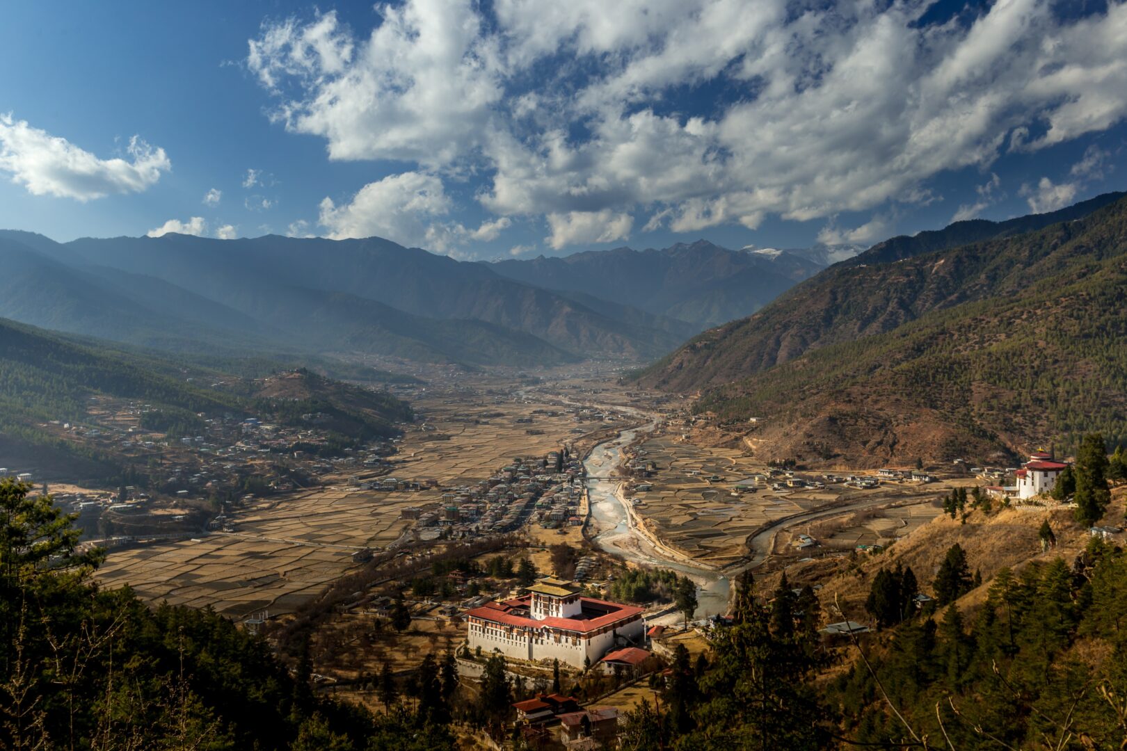Later, take an easy but spectacular hike above the valley to Zurig Dzong. From here, panoramic views stretch across Rinpung Dzong, the palace, the festival grounds, and the valley framed by distant peaks.