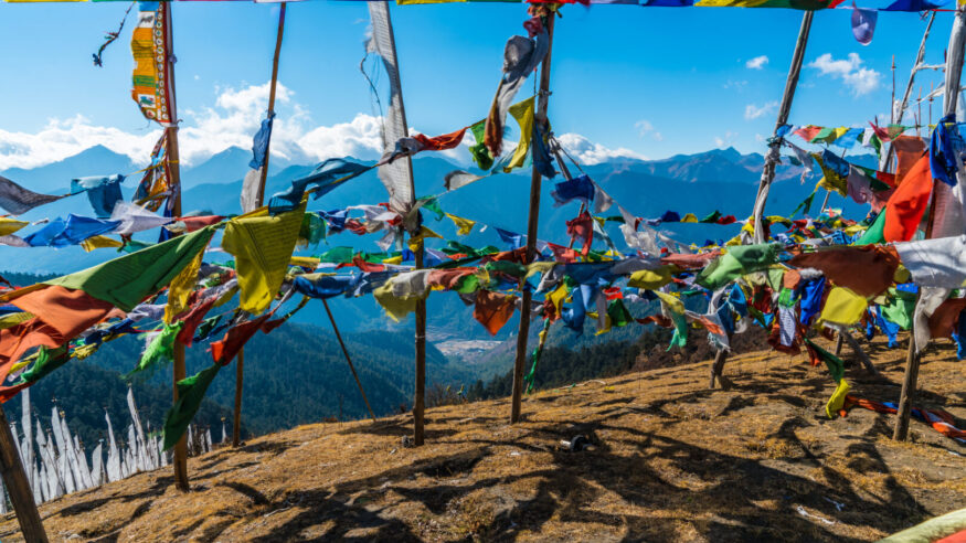 Climbing above blue pine and rhododendron forests, the road opens into alpine meadows dotted with azaleas, edelweiss, and, in season, the rare blue poppy. Views of Mount Jhomolhari, the “Bride of Kanchenjunga,” appear at nearly every bend, with the Haa Valley, Tibet, and the Paro Valley stretching out below.