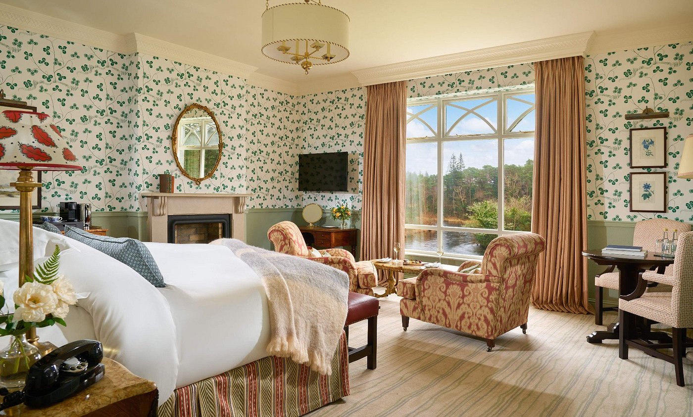Set on a 700-acre estate in Connemara, Ballynahinch Castle Hotel is an 18th-century castle overlooking the Ballynahinch River. The property offers 48 rooms and suites, many with river or woodland views, furnished in a country-house style with modern comforts. The Owenmore Restaurant highlights seasonal Irish produce, while the Fisherman’s Pub provides a more casual setting with open fires and traditional atmosphere. Interiors feature antiques, wood-paneled rooms, and historic details that reflect the castle’s long heritage.