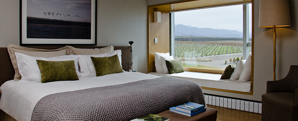 Set on a 790-acre estate in the foothills of the Andes Mountains, Casa de Uco has a sleek, minimalistic style designed to harmonize with the surrounding landscape. Common areas include an award-winning restaurant, wine bar and lounge, outdoor pool, game room, and a living room with fireplace. Terraces overlook the private vineyards, where guests can dine among the vines or participate in excursions like wine tasting, horseback riding, and carriage rides.
