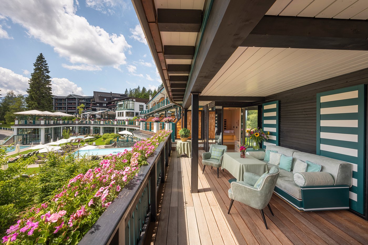 Alpin Resort Sacher Seefeld is a 5-star superior resort set on a private plateau above Seefeld, overlooking the village and surrounding Tyrolean mountains. The hotel offers rooms and suites in an elegant alpine style and features several restaurants serving Austrian and international cuisine, as well as a cocktail bar. It has a large outdoor garden with a spacious swimming pool and a natural swimming pond. Its extensive spa includes a heated outdoor whirlpool, an indoor swimming pool, multiple saunas and steam baths, relaxation areas, treatment rooms, and a gym.