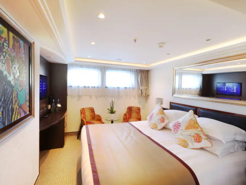 The AmaBella is a refined European river cruise ship designed for about 162 guests, featuring spacious twin-balcony staterooms with marble bathrooms and modern amenities. Guests can dine in the main restaurant, the open-kitchen Chef’s Table, or the al-fresco Café Bistro, each serving regional and international cuisine with fine wines. Leisure facilities include a heated pool and whirlpool on the sun deck, a putting green, giant chessboard, fitness room, sauna, and massage services, as well as bicycles available for guided or independent shore excursions. The ship’s elegant design emphasizes comfort and space, offering an intimate, boutique cruising experience.