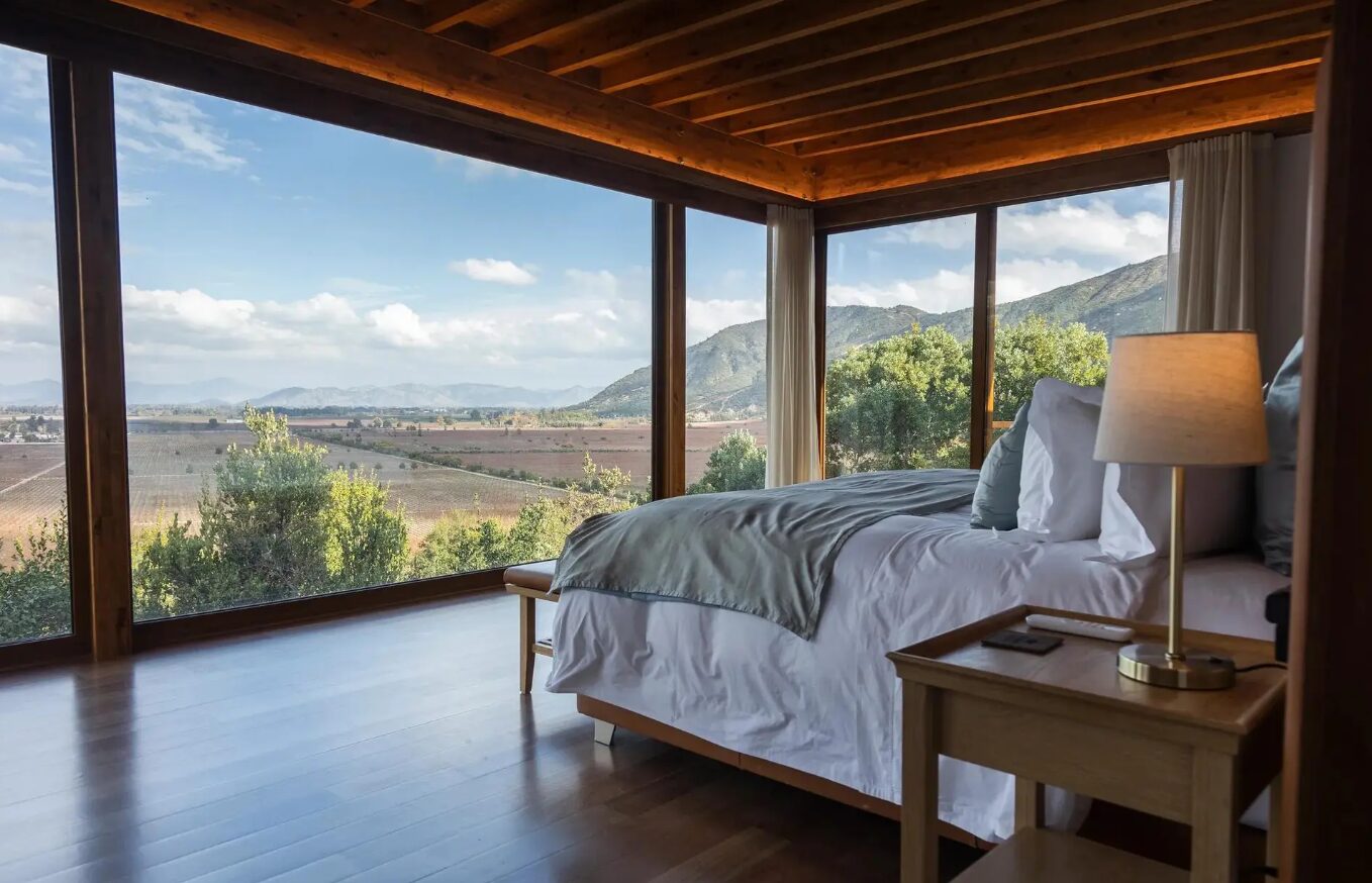 Clos Apalta Residence is an exclusive wine estate retreat set on a hillside within the Clos Apalta vineyard in Chile’s Colchagua Valley near Santa Cruz. The property consists of a small collection of private casitas and villas positioned across the slope, connected by landscaped paths overlooking the surrounding vineyards and mountains. Facilities include a restaurant focused on seasonal local cuisine, a wine cellar and tasting room highlighting the estate’s wines, a large outdoor swimming pool, and a lounge and terrace spaces oriented toward the valley views. The grounds form part of the working Clos Apalta winery, allowing guests direct access to the vineyard and cellar experiences within the estate.