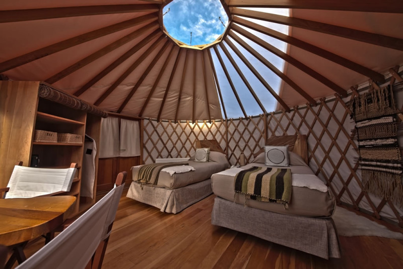Patagonia Camp is located on a 84,000-acre private reserve amid a native coigüe evergreen forest full of ancient Nothofagus plants like lenga and notros that bloom in spring. Situated on the shores of Lake Toro, the largest lake in the Magallanes region of Chile, the lodge is just 9.5 miles from the main entrance to Torres del Paine National Park and enjoys incredible views of the Macizo del Paine. The complex at Patagonia Camp comprises 20 first class yurts, all of which have view of either Lake Toro and the Paine Massif, or the native forest, as well as a central lodge that serves as a restaurant, bar and lounge. Elevated walkways connect all of the buildings, and the site blends non-intrusively into the surroundings.