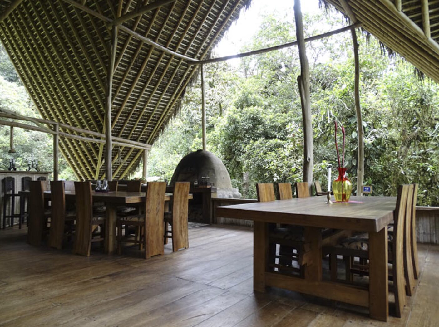 El Monte Lodge has six individual thatched cabañas and a natural swimming pool filled from the fast-flowing river that borders the property. The main house includes the kitchen and dining area, a game area, a bar, plus two open “fogatas” or fire pits. The majority of the house is open air, with expansive views of the garden and surrounding forest. Meals are mostly vegetarian, created from locally-grown organic vegetables.