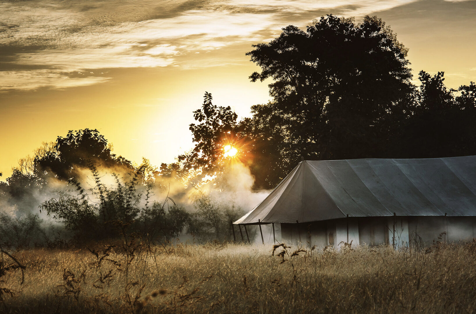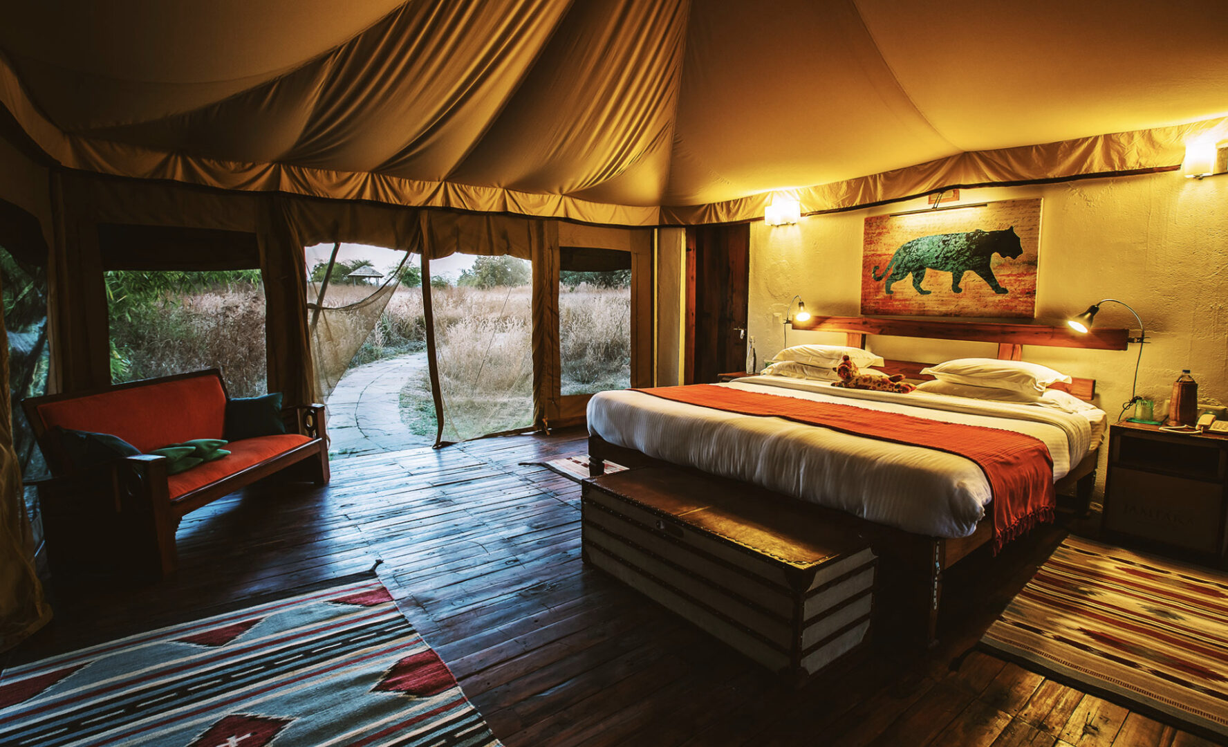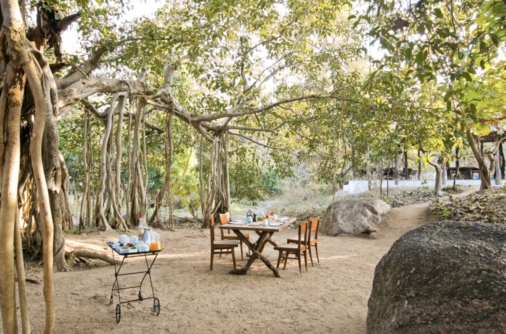 Inspired by an ancient banyan tree and built to cause the least impact to the surrounding environment, Jamtara Wilderness Camp was built to provide an unforgettable experience with sustainability as its cornerstone. Jamtara provides for the ideal atmosphere to relax, whether it's birdwatching, taking a swim in the infinity pool, or unwinding with a drink under the stars. 10 luxury tents make up the camp, each designed to allow an optimum view of nature. With the option of rolling up the front panels of the tent, the guests can lounge on the patio, which overlooks a dry river bed.