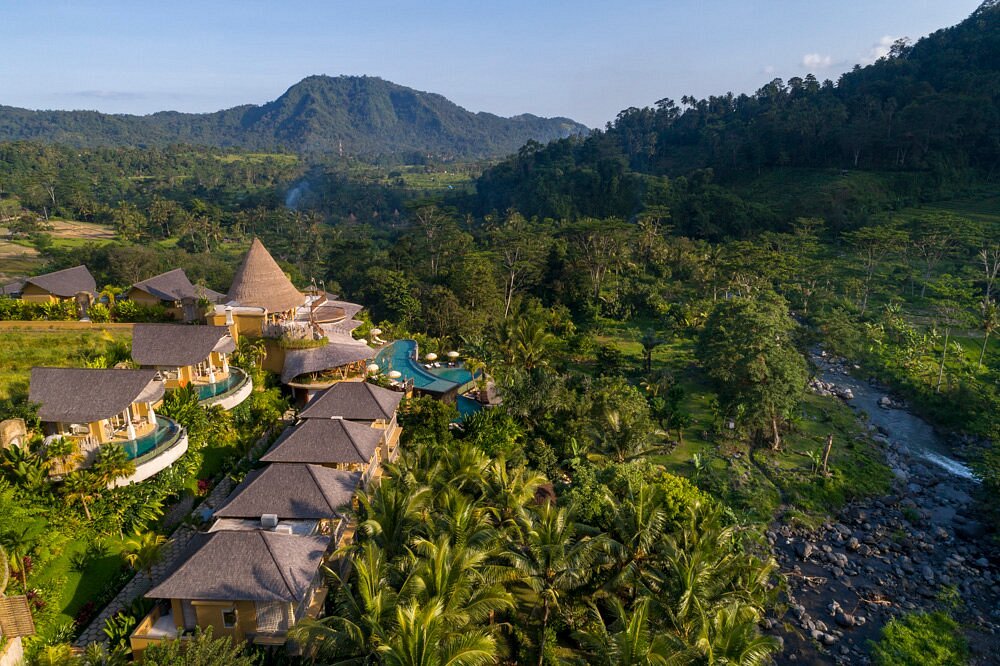 Wapa di Ume Sidemen is a tranquil hillside retreat overlooking rice terraces and the sacred Mount Agung in eastern Bali. The resort features spacious villas and suites with private plunge pools, outdoor bathtubs, and natural stone finishes. Facilities include a two-tier infinity pool, a riverside spa, a yoga pavilion, and a restaurant serving Balinese and international cuisine. The property’s design emphasizes traditional Balinese craftsmanship and offers sweeping views of the surrounding valley and villages.