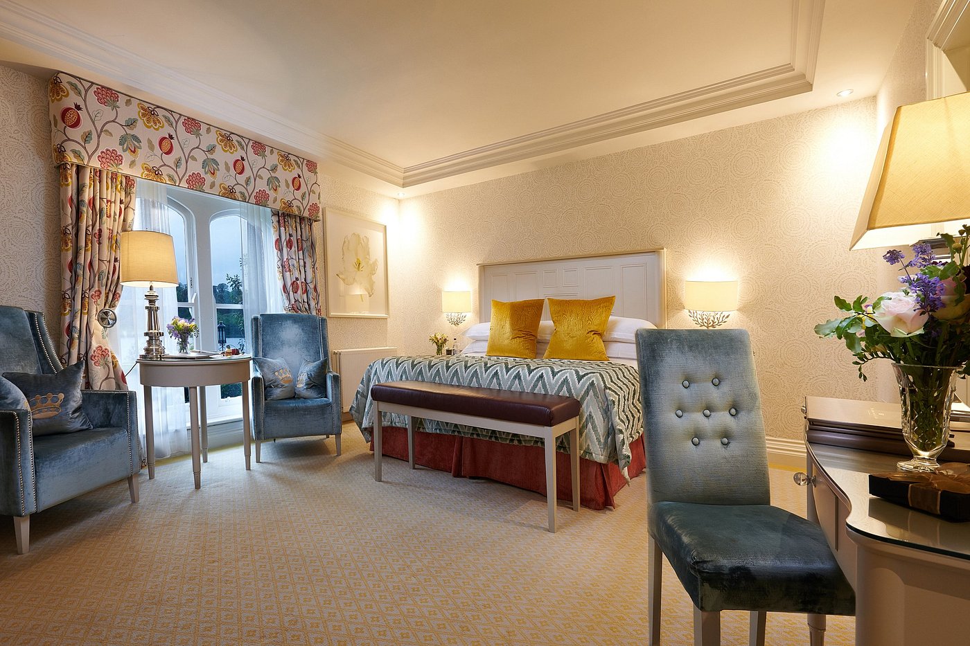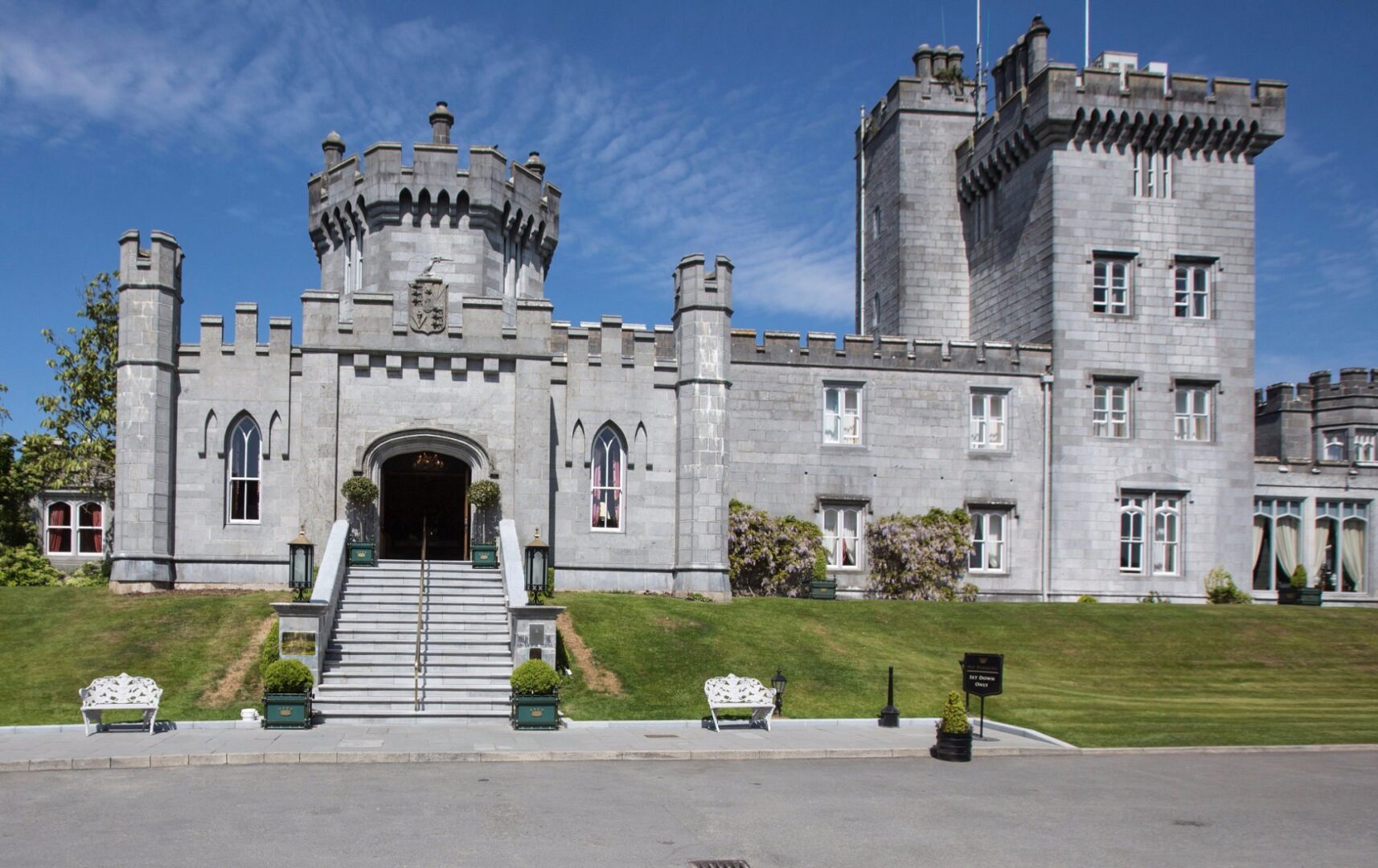 Dating back to the 16th century, Dromoland Castle Hotel is one of Ireland’s most iconic castle stays. The property has 97 rooms and suites featuring period furnishings and modern amenities, many with views over the estate’s lake and woodlands. Facilities include a fine-dining restaurant, a traditional bar, a spa with indoor pool, and an 18-hole championship golf course. The 450-acre estate offers activities such as falconry, horseback riding, archery, and fishing, along with walking and cycling trails.