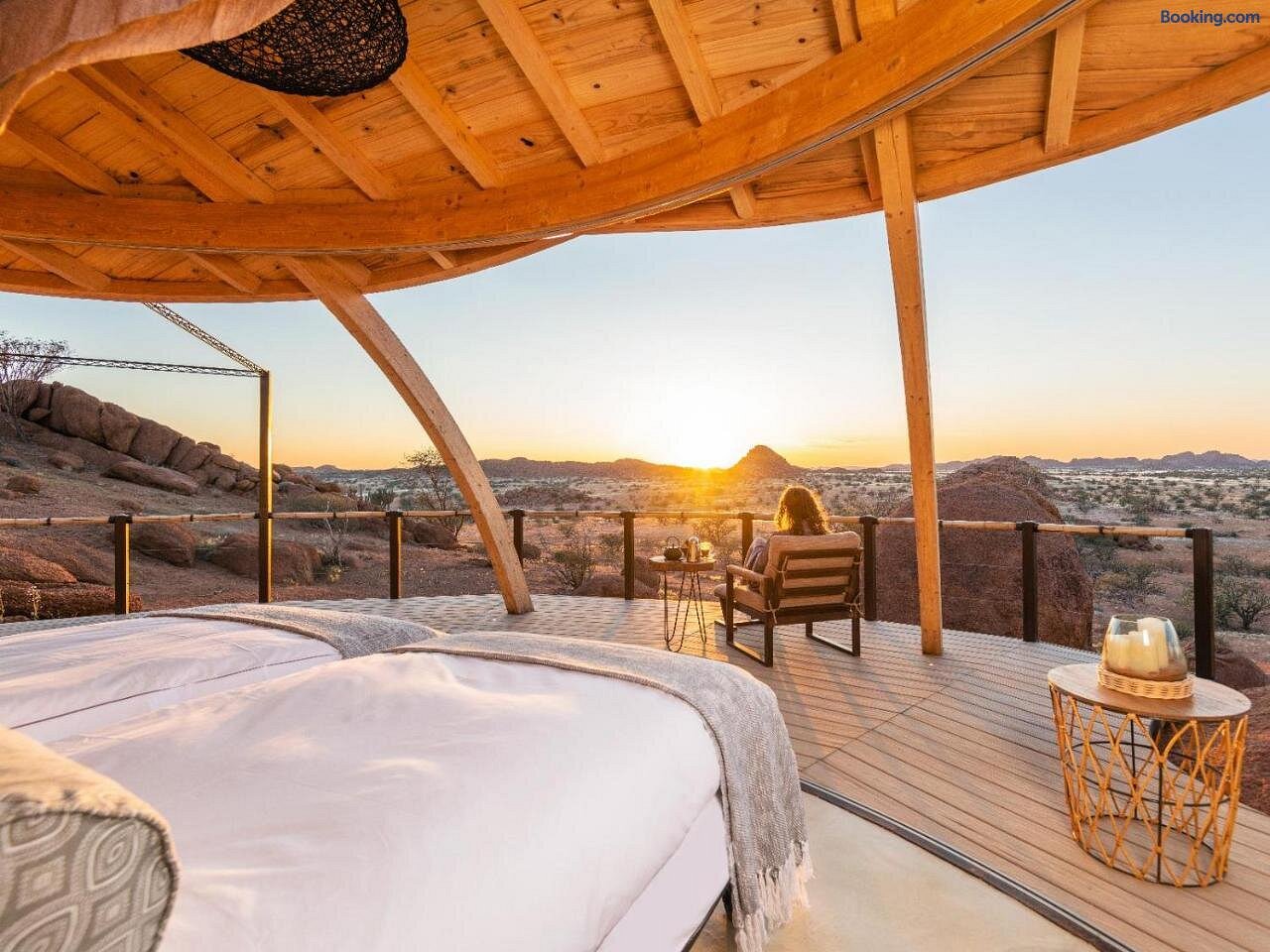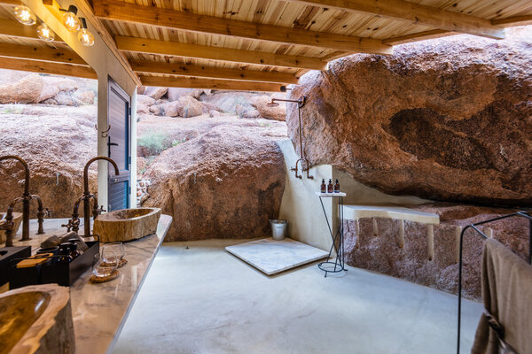 Onduli Ridge is a boutique luxury camp set amid granite boulders in the Doro !Nawas Conservancy in Namibia’s Damaraland. The lodge comprises six elevated suites, each featuring a king-size climate-controlled bed, a partially open-air bathroom with rain shower and flush toilet, and a private deck where the bed can be rolled outside for starlit sleep. Facilities include a communal lounge, library, dining room and bar, an infinity-edge swimming pool set into the rock, and a wildlife-viewing waterhole adjacent to the camp for unobstructed sightings. The setting offers sweeping views of Namibia’s highest mountain, the Brandberg, and the remote arid plains beyond the granite ridge.