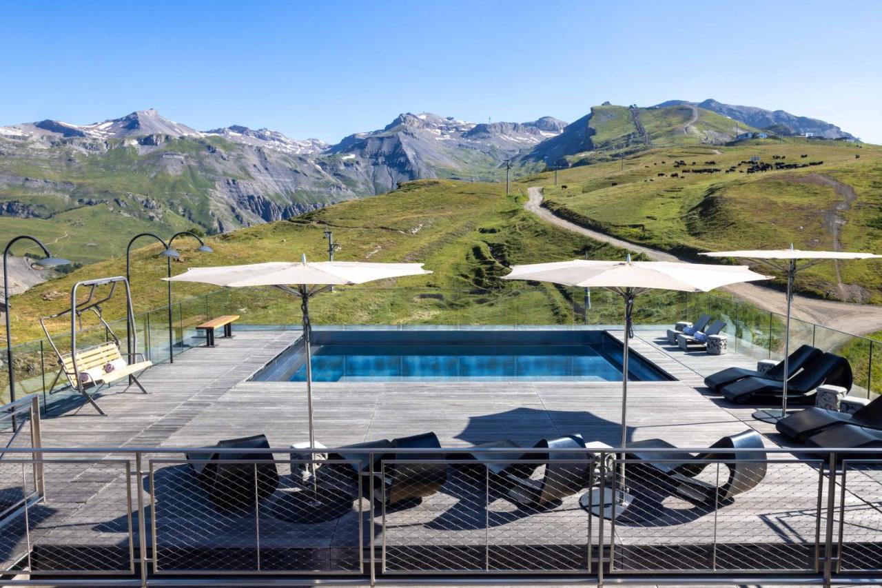 The Chetzeron Hotel is an architectural masterpiece at 2112 meters above sea level, high above the Rhone Valley with a magnificent view from the Matterhorn to Mont Blanc. The former mountain station has been converted into a boutique hotel with the Minergie-Eco standard, with 16 junior suites and rooms in an urban-alpine style, a spa area, meditation room, lobby with fireplace, bar and 3 restaurants, and of course a ski-in and ski-out experience in winter.