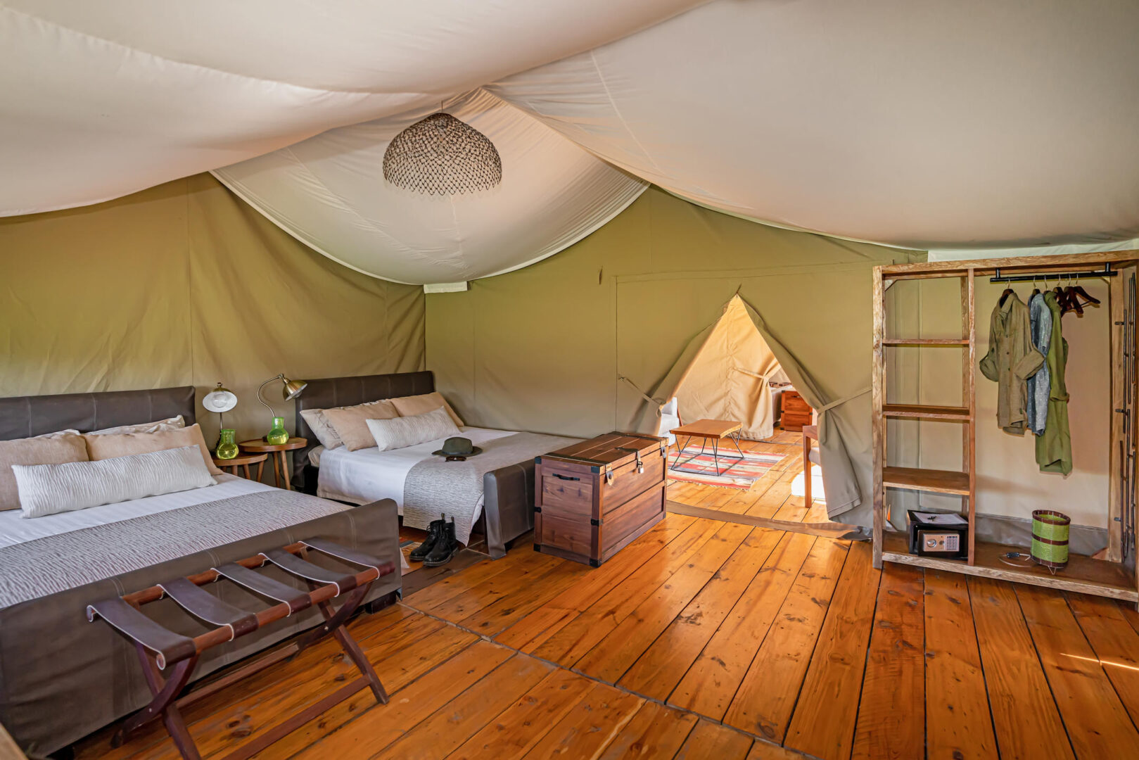 Each of the en-suite tents has 2 Queen beds and features an outside deck with loungers overlooking the surrounding nature. The dining tent includes a separate bar, and there are sitting and dining areas in the main tent with cozy leather sofas. Guests can enjoy a scenic sundowner outside, then end the night relaxing around the campfire.