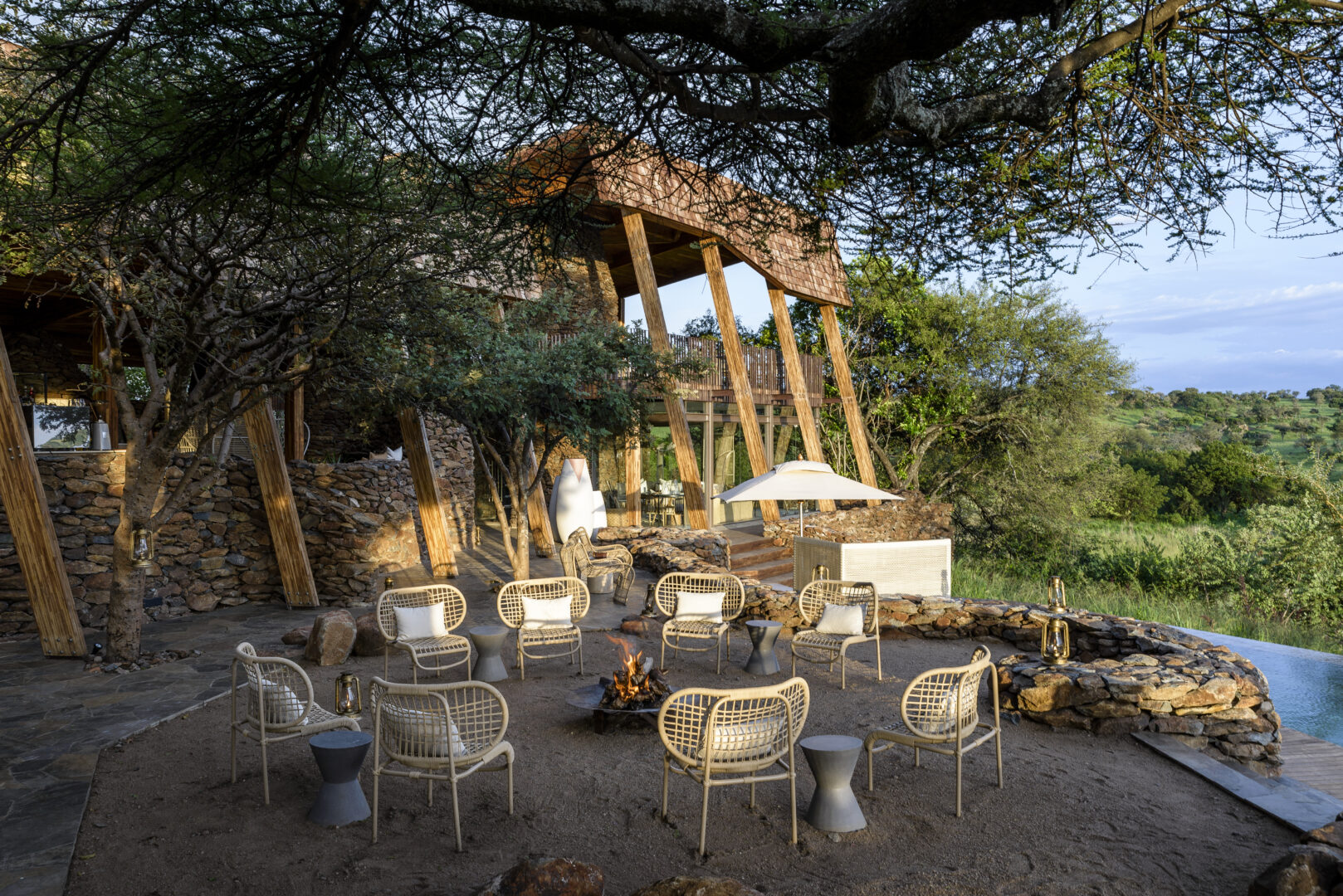 Situated in the western corridor of the legendary Serengeti, Singita Faru Faru Lodge overlooks a natural waterhole and the tree line of the Grumeti River. The nine stone, canvas and thatched luxury suites (including a family suite and a 2-bedroom villa) have the air of a classic safari camp, yet the interiors offer the ultimate in contemporary chic with panoramic glass windows, mirrored room dividers and sumptuous soaker tubs.